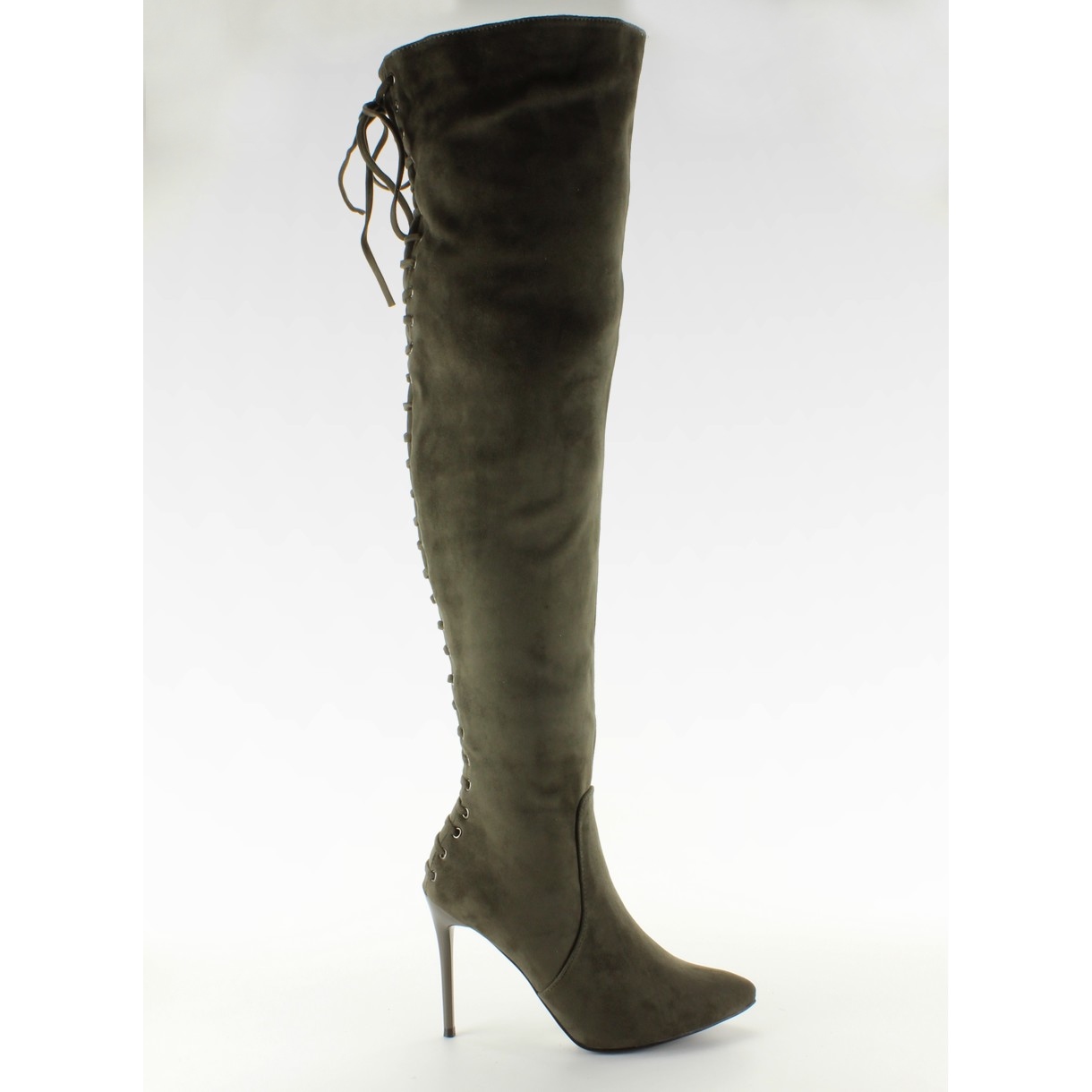 Hermosas y muy sensuales botas hasta el muslo en un delgado talón de 10.5 cm de alto. En la parte posterior, los cordones decorativos agregan coquetería. Es solo un adorno, no se usa para cambiar la circunferencia de las botas. Los zapatos están completamente aislados con pieles delicadas.