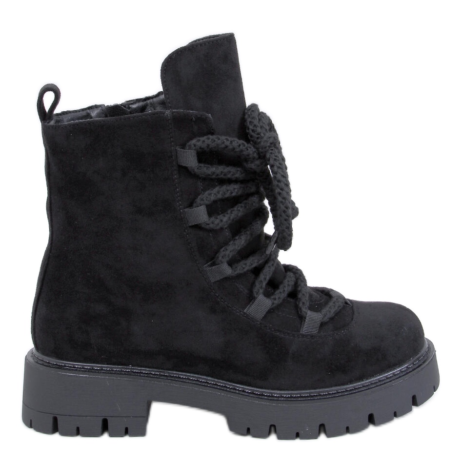 Descubra el último éxito de la temporada: botas atadas con gruesos cordones negros sin SM en un elegante color negro. Estos trabajadores de gamuza en una suela sólida y gruesa se ajustan perfectamente a las últimas tendencias, atrayendo atención y deleite con su estilo original. Diseñado para mujeres modernas que valoran no solo el diseño de moda, sino también la comodidad.