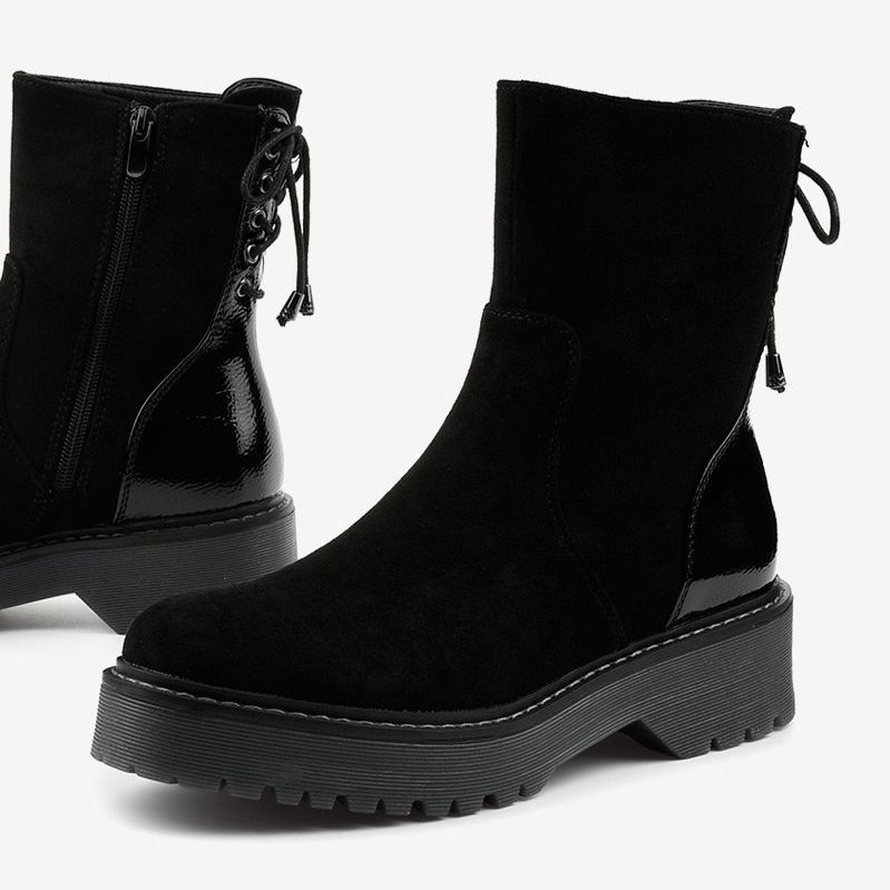 Botas de mujer Keensallow elegantes y atemporales hechas de cuero ecológico con textura de gamuza. El modelo de tobillo combina la comodidad y un personaje urbano de moda: el aislamiento con un inserto de material hace que los zapatos funcionen perfectamente en los días más fríos, y 4.5 cm la plataforma agrega algunos centímetros sin perder estabilidad. El sujeto en el control deslizante hace que sea más fácil poner rápidamente, mientras que los cordones decorativos y el inserto barnizado en la parte posterior enfatizan la forma elegante.