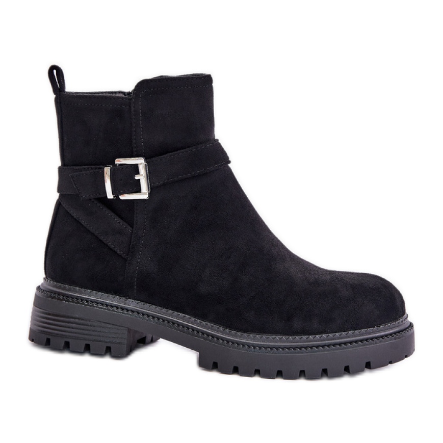 Las botas para mujeres aisladas con abrazadera negra negra son una gran opción para los días geniales de otoño e invierno. Hecho de gamuza ecológica de alta calidad, estas botas bajas combinan elegancia y comodidad del uso. Ubicado en un talón estable y plano con una altura de 4 cm, proporcionan comodidad durante las actividades diarias y, al mismo tiempo, agregan un acento elegante de cualquier estilización.