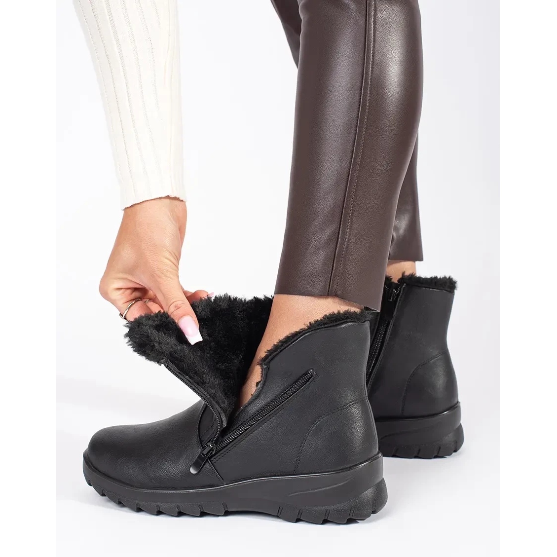 El modelo de botines de mujer cómodos y aislantes se caracteriza por un diseño sencillo y sin estampado en el clásico color negro, lo que los convierte en un elemento extremadamente universal de cualquier armario. El cierre de cremallera facilita ponerse y quitarse los zapatos, y el ancho superior de 28 cm hace que se adapten a cualquier tipo de pierna.