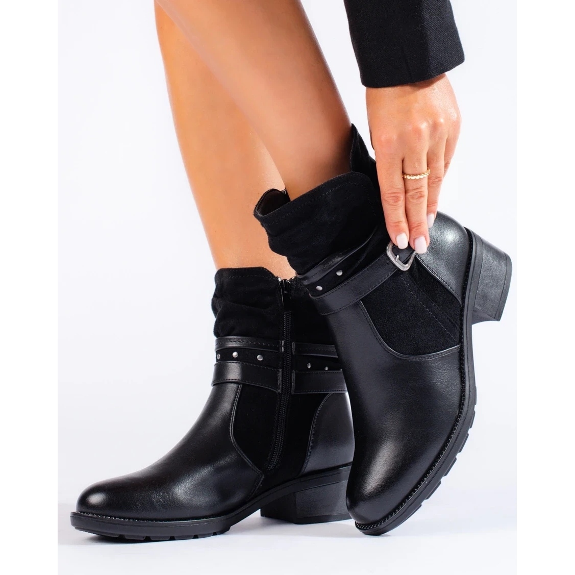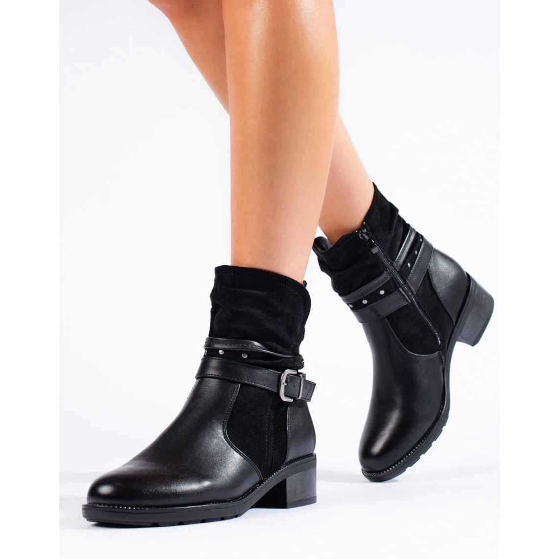 Los elegantes botines de mujer con una correa decorativa negra son la elección perfecta para las mujeres que valoran la moda y la comodidad. Confeccionados en piel ecológica y ante ecológico de alta calidad, sin duda llamarán la atención por su estilo elegante y casual.