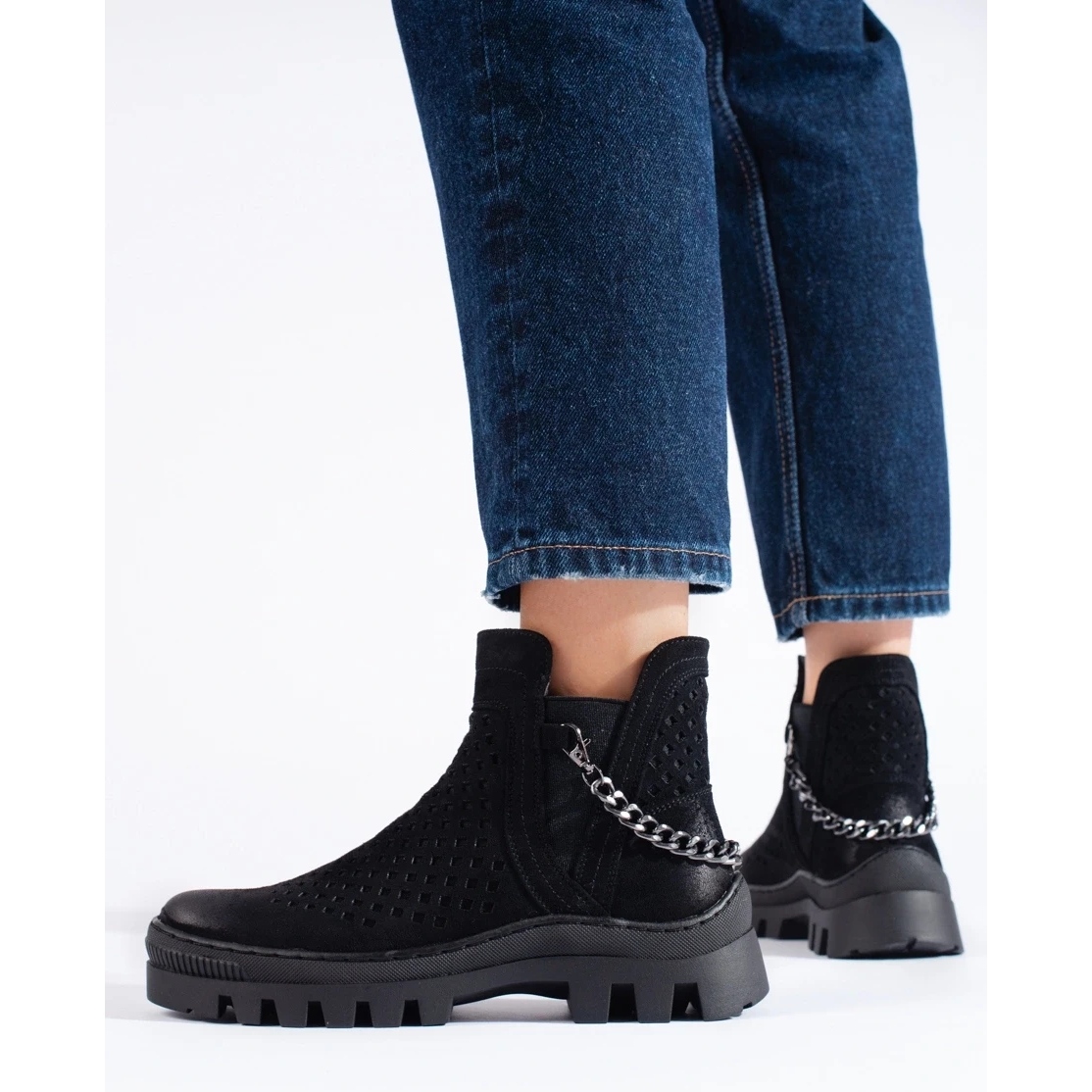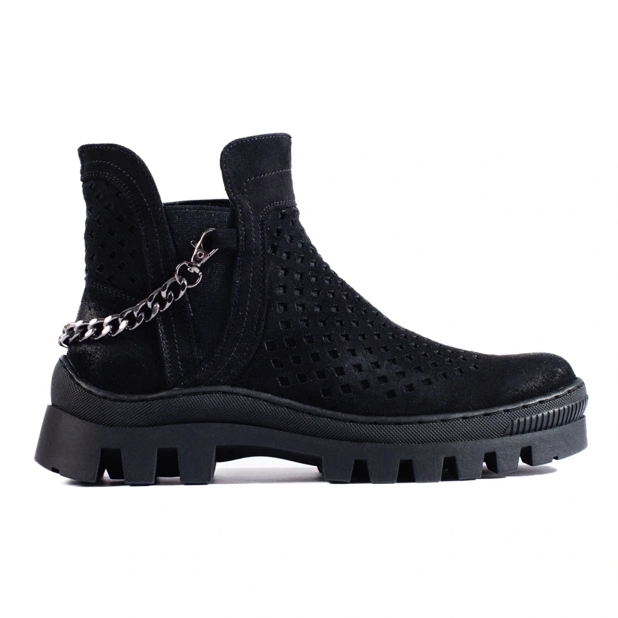 Perfectos para un estilo informal y cotidiano, estos botines de W. Potocki son universales y están de moda. Una ventaja adicional es la cadena, que les da un aspecto único y elegante. Las botas están reforzadas y reforzadas en la parte trasera, lo que garantiza estabilidad y comodidad de uso.