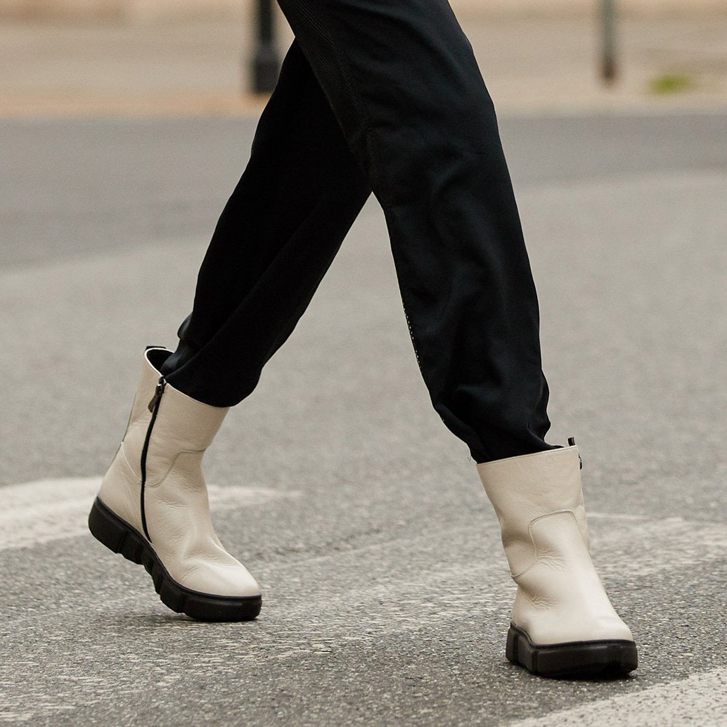 Estéticamente, los botines blancos son universales y combinan tanto con unos vaqueros casual como con un vestuario más deportivo. No tienen un patrón dominante, lo que los hace fáciles de combinar con una variedad de prendas. Los zapatos se cierran con cremallera, lo que hace que sean fáciles de poner y quitar.