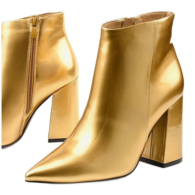 Los botines dorados en el poste son una propuesta para mujeres seguras de sí mismas a las que les gusta brillar entre la multitud. Los zapatos no solo tienen el color original, sino también el corte. Sus indudables ventajas son un tacón estable de tipo poste y una suela duradera y flexible. La comodidad se incrementa además con una plantilla perfilada. El calzado está hecho de cuero ecológico de buena calidad.