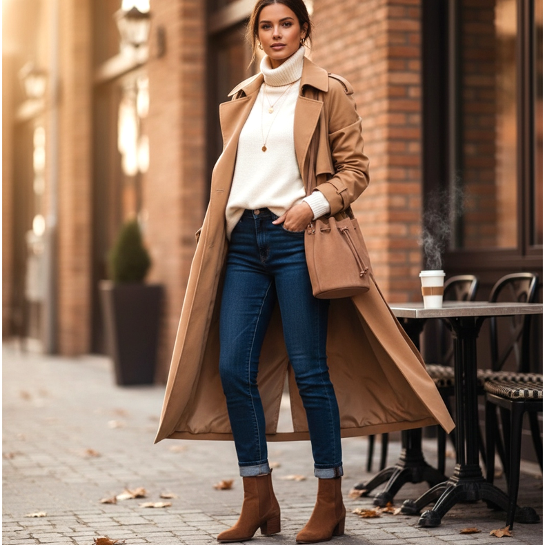 Este conjunto se completará con una gabardina larga color camel, un bolso bombonera de ante nude y discretas joyas doradas. Es un look que puedes usar tanto para el café de la mañana como para una reunión de negocios informal en la oficina. Es cómodo, elegante y siempre actualizado.