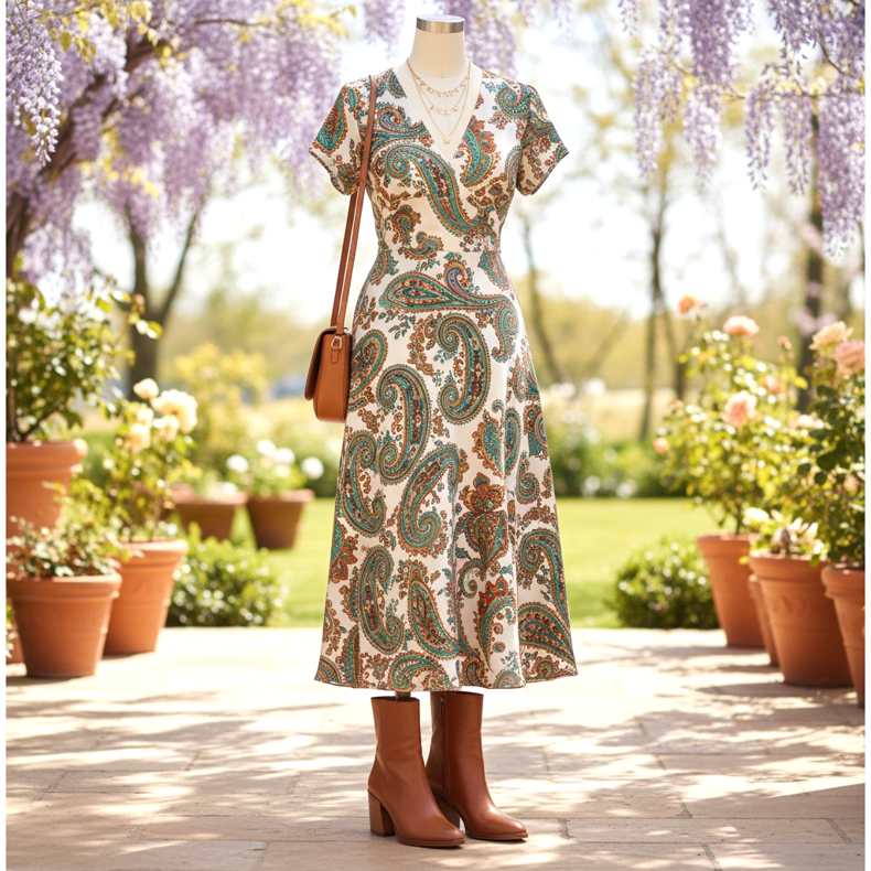 Un vestido midi confeccionado en viscosa o seda con estampado paisley o floral combinado con botines marrones de tacón alto es el look perfecto para una boda de primavera o el cumpleaños de un ser querido. Agregue un bolso al hombro de cuero color canela y un collar delicado: el efecto está listo.