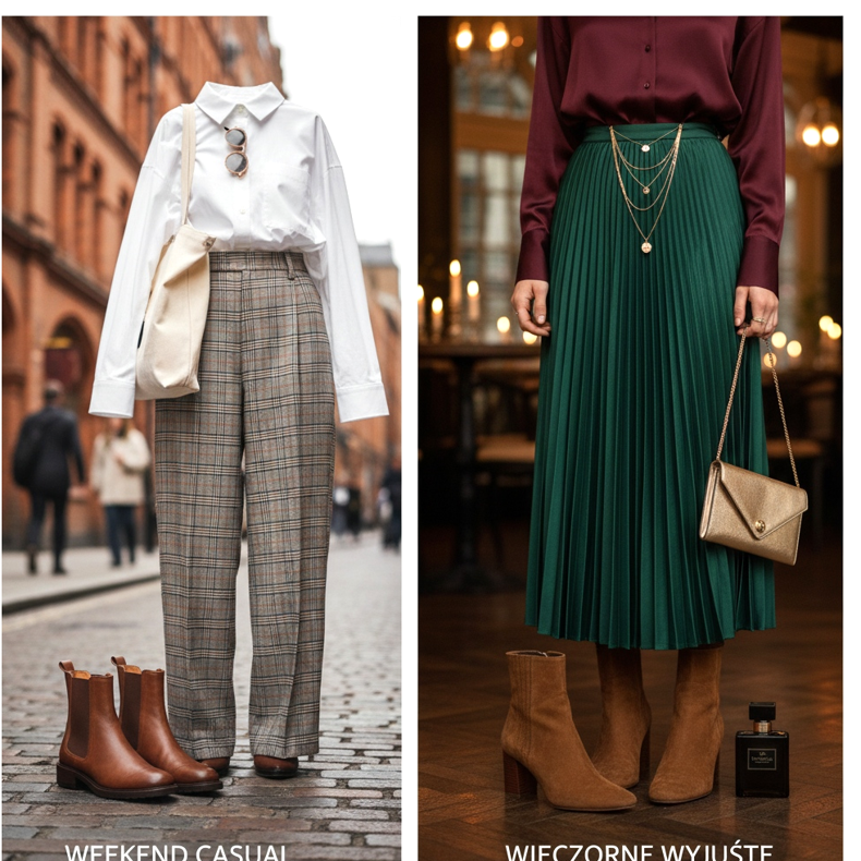 Fin de semana casual: Pantalones anchos a cuadros (los llamados pantalones a cuadros) combinados con una camiseta blanca o una sencilla camisa Oxford y botas Chelsea marrones: este es un look inspirado en las calles de moda de Londres, que funciona igual de bien para las compras de fin de semana que para una cafetería con amigos. Un bolso largo de piel o un bolso de lona son el complemento perfecto.
