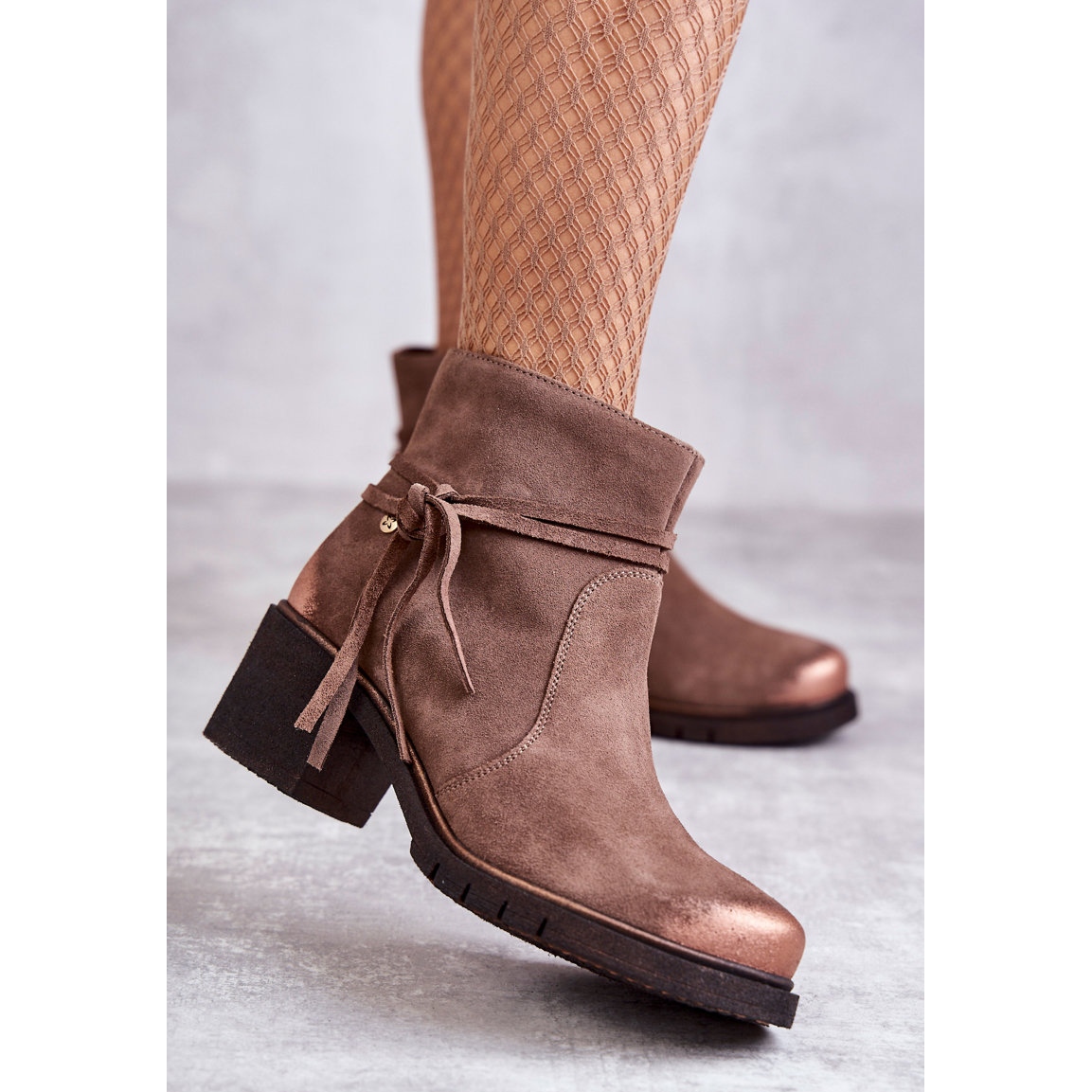 Los botines de mujer de ante Maciejka 05720-14 en color marrón claro son una excelente opción para las mujeres que valoran la combinación de estilo y comodidad. Fabricadas en piel natural de primera calidad, estas botas se distinguen por su elegante diseño y cuidados acabados. Una tira decorativa en el lateral de la pala, atada con un encantador nudo, les confiere un carácter único.