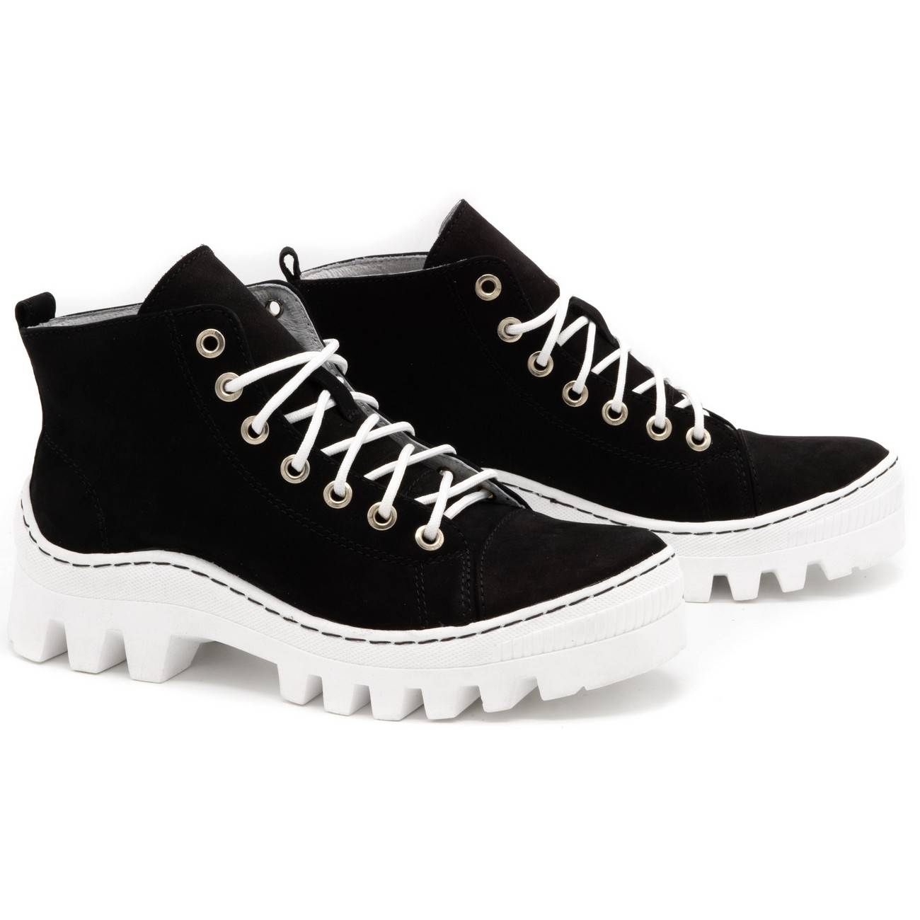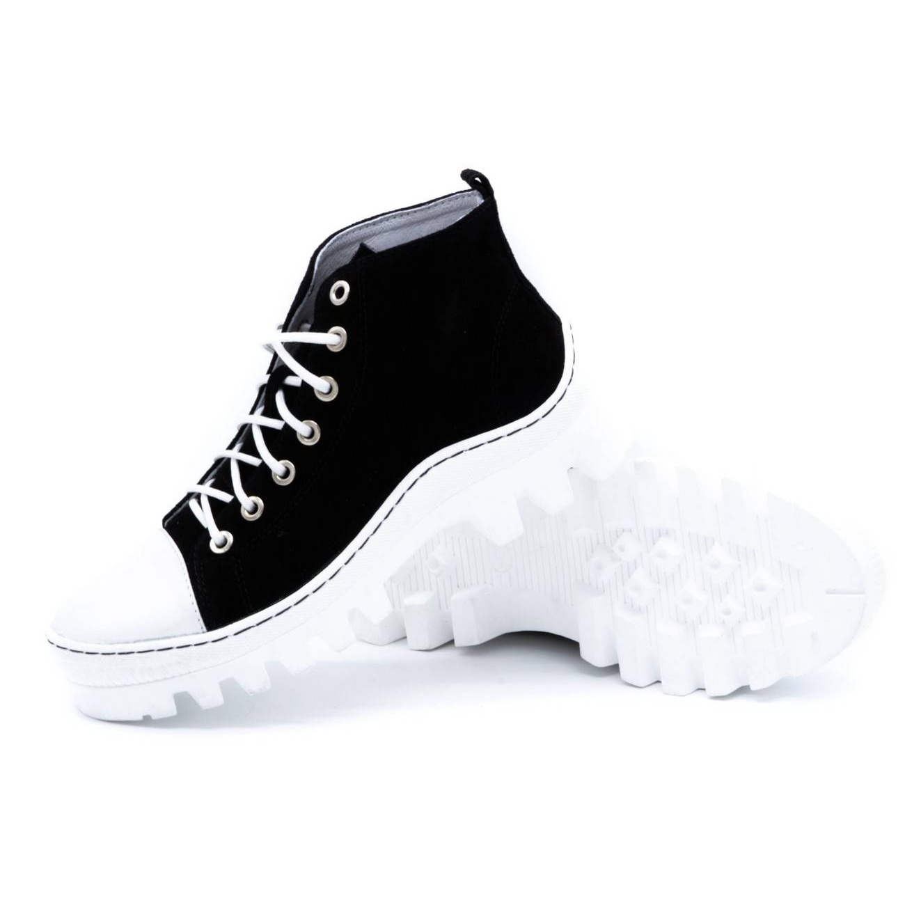 Hecho de cuero de gamuza natural de alta calidad en un tono de negro "negro (perla negra)", con una suela blanca contrastante. El interior y el inserto también del cuero natural, lo que garantiza la comodidad y la buena transpirabilidad del pie. Una plataforma estable con una altura de 4 cm y una parte superior alta en frente del tobillo (9 cm) garantiza la comodidad durante las caminatas más largas y agregan una altura sutil. Las botas tienen una nariz redonda y un cordón clásico, gracias a los cuales puede combinarlas fácilmente con el pie. Sin aislamiento: perfecto para días temporales y fríos sin heladas.