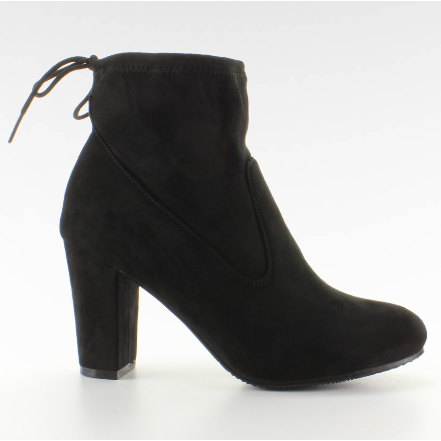 Botas de mujer bien formadas en gamuza ecológica. Tienen un tacón ancho y estable con una altura de 8,5 cm. En el tobillo, una cadena. Zapatos ideales para las temporadas de transición.
