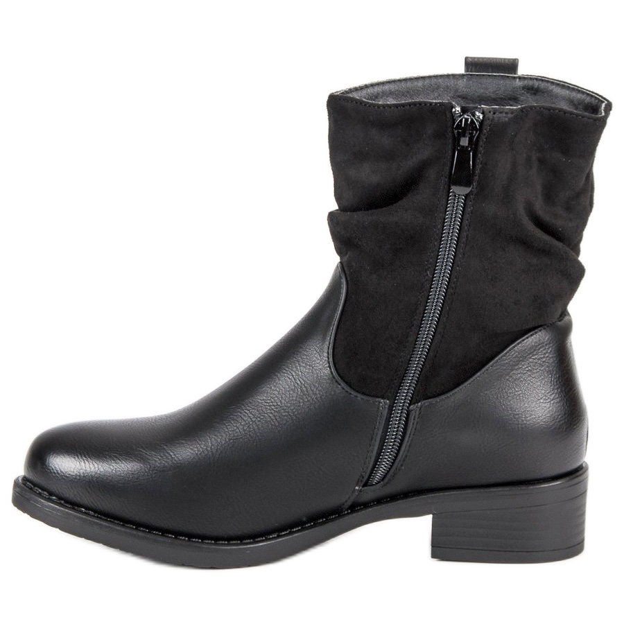 Descubra unas botas de trabajo negras únicas que se convertirán en un elemento insustituible del guardarropa de toda mujer. Estos elegantes zapatos son la combinación perfecta del estilo clásico y los toques rockeros que están de moda hoy en día. Elaborados con una atención excepcional al detalle, se caracterizan por una interesante combinación de materiales: una parte superior de ante ecológico en un tono diferente de negro entrelazado con una elegante piel ecológica, lo que les confiere un carácter único.