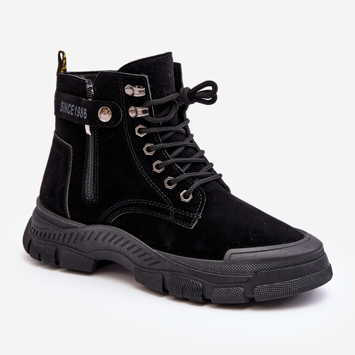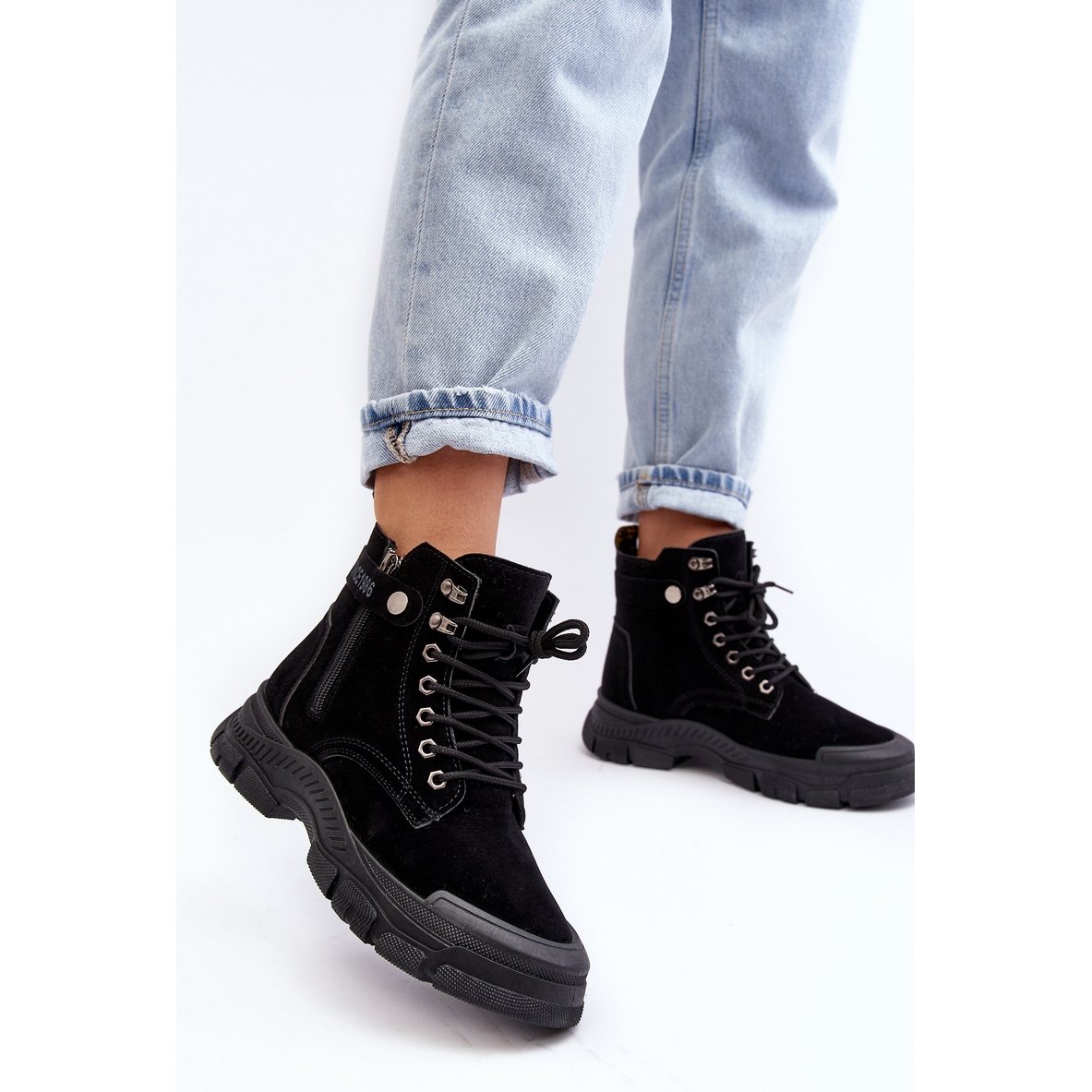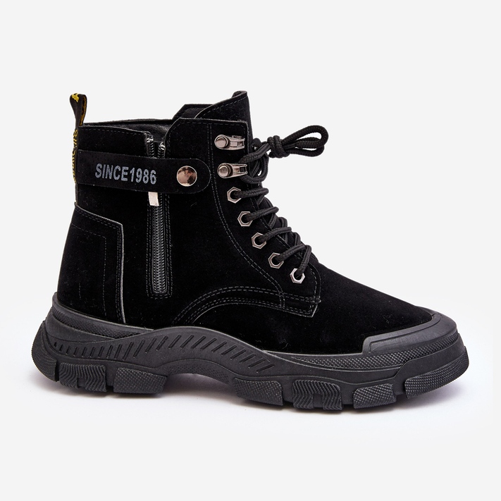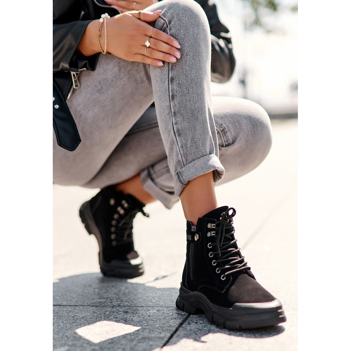 Cazadores de mujer con tacón plano y plataforma. Confeccionado en ante ecológico. Se cierra con cremallera en el lado exterior de la pala y se ata adicionalmente. El talón está rígido y las puntas redondeadas. La suela maciza y el tacón plano hacen que las botas sean estables cuando se utilizan en superficies irregulares. El interior está aislado con pelo grueso. Al elegir una talla, utilice la tabla de tallas.
