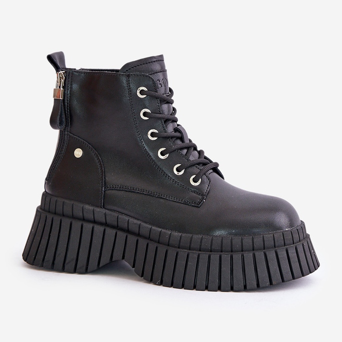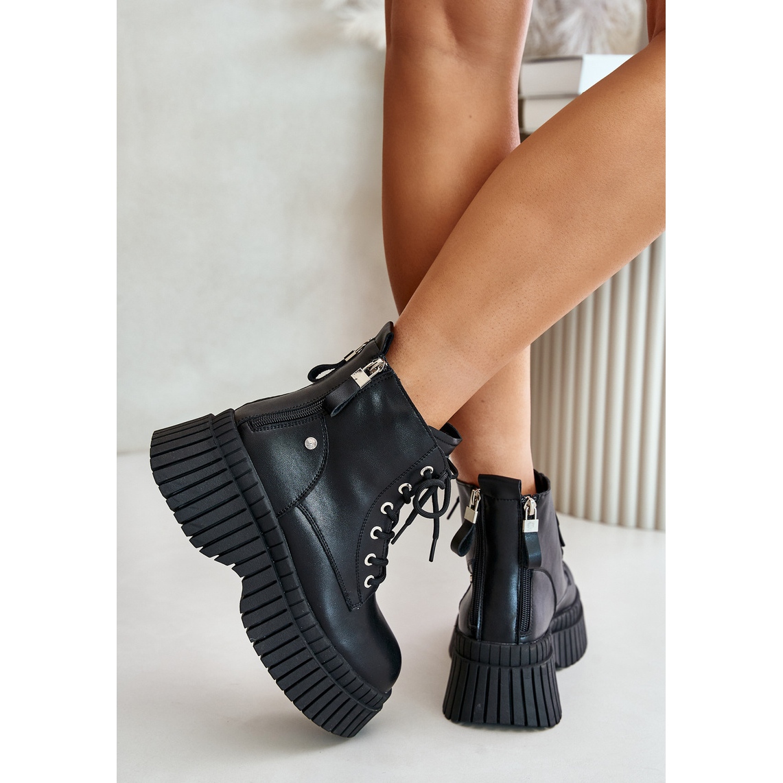 Cerradas con cremallera y además con cordones, estas botas permiten un ajuste perfecto al pie, lo que aumenta la comodidad de uso. La altura superior de 12 cm y la plataforma de 5 cm hacen que el calzado no sólo sea funcional, sino también elegante, añadiendo elegancia a cualquier conjunto.