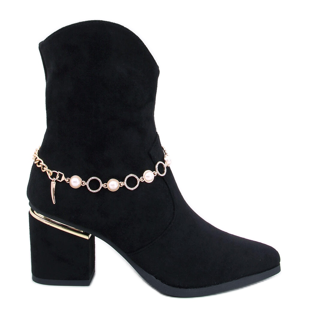 Elegantes botas de bralin para mujeres de gamuza en negro es una combinación de un corte de vaquero de moda con elegancia femenina. El poste de 7,5 cm de altura delgada la silueta maravillosamente, y la cadena efectiva soplada con piedras y perlas brillantes agrega carácter y brillo en cada paso. El dedo del pie de almendra taperal alarga ópticamente el pie, y el bloqueo práctico en el interior de la parte superior facilita rápidamente la colocación.