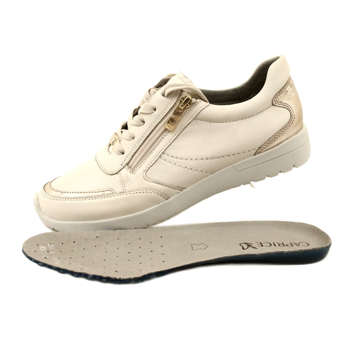Elegante y cómodo, perfecto para la ciudad, para caminatas y todos los días. El modelo Caprice 9-23765-20 165 está hecho completamente de cuero suave y natural en un tono beige atemporal con sutiles inserciones doradas en el frente y el talón. Una delicada plataforma de 3 cm da la ligereza y la elegancia de la figura, al tiempo que garantiza la estabilidad y la reflexión elástica en cada paso.