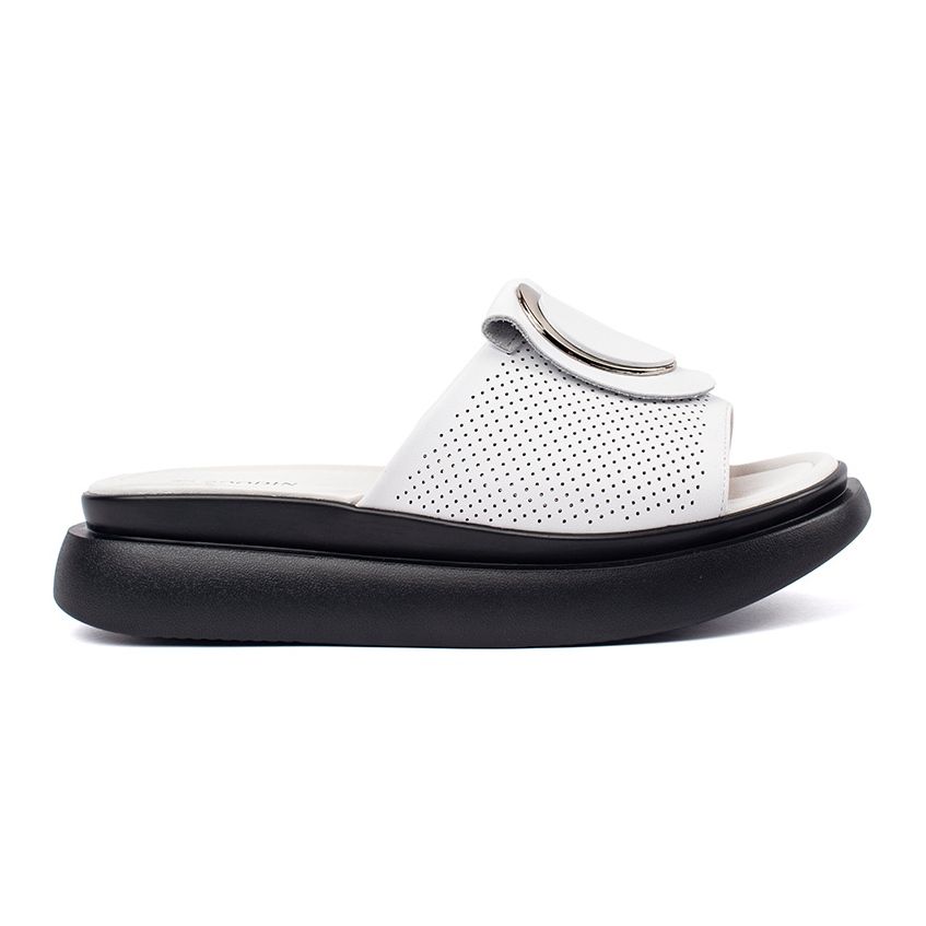 Dentro de las aletas hay un inserto de cuero ecológico, que garantiza la ventilación adecuada de los pies y elimina el exceso de humedad. El color blanco y blanco hace que estas chanclas se adapten fácilmente a varios estilos, ya que un vestido de verano y pantalones cortos.