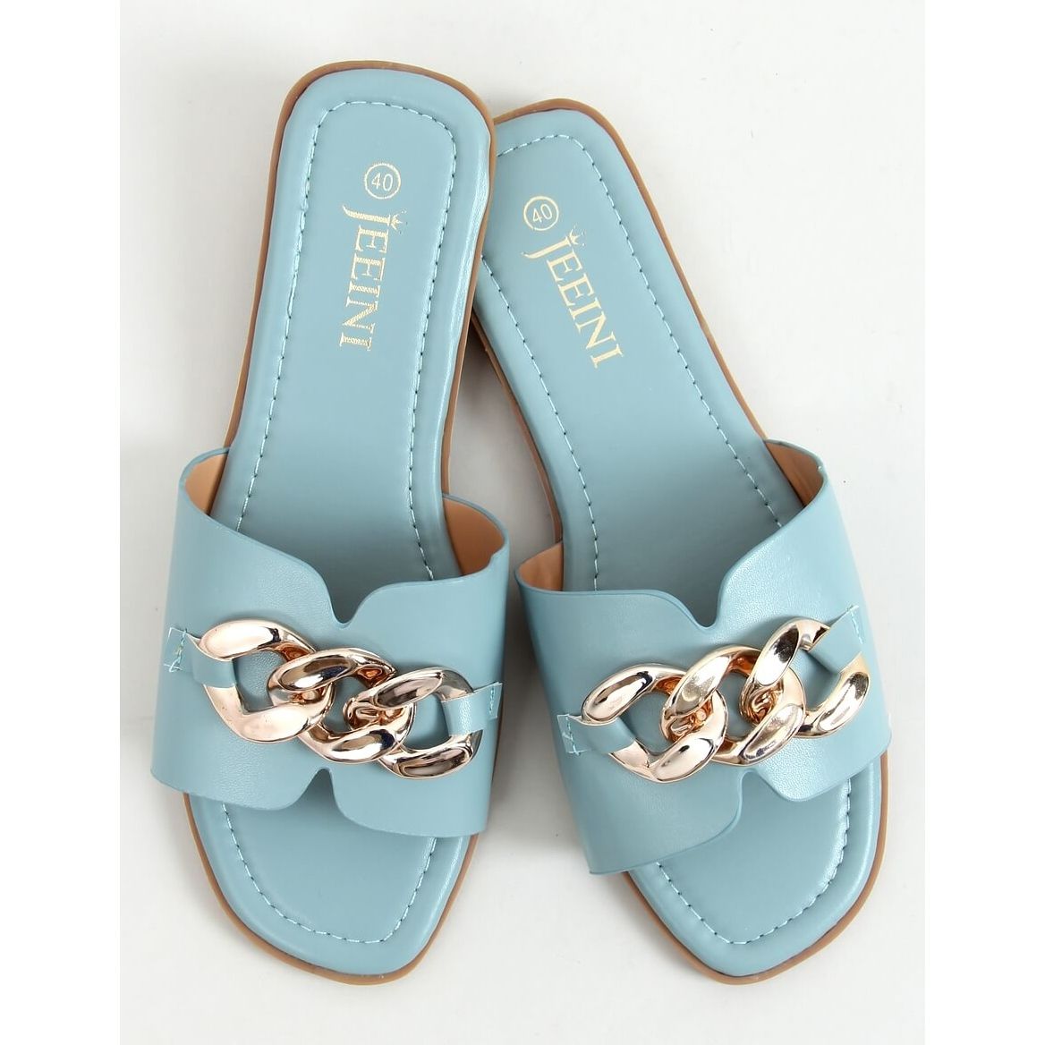 Fabricadas en piel ecológica de alta calidad, estas chanclas combinan comodidad con elegancia. Los colores en tonos azules con detalles en cadenas doradas hacen que combinen perfectamente con vestidos de verano y estilos informales. La suela beige aporta sutileza y el tacón plano la hace cómoda de llevar durante todo el día.