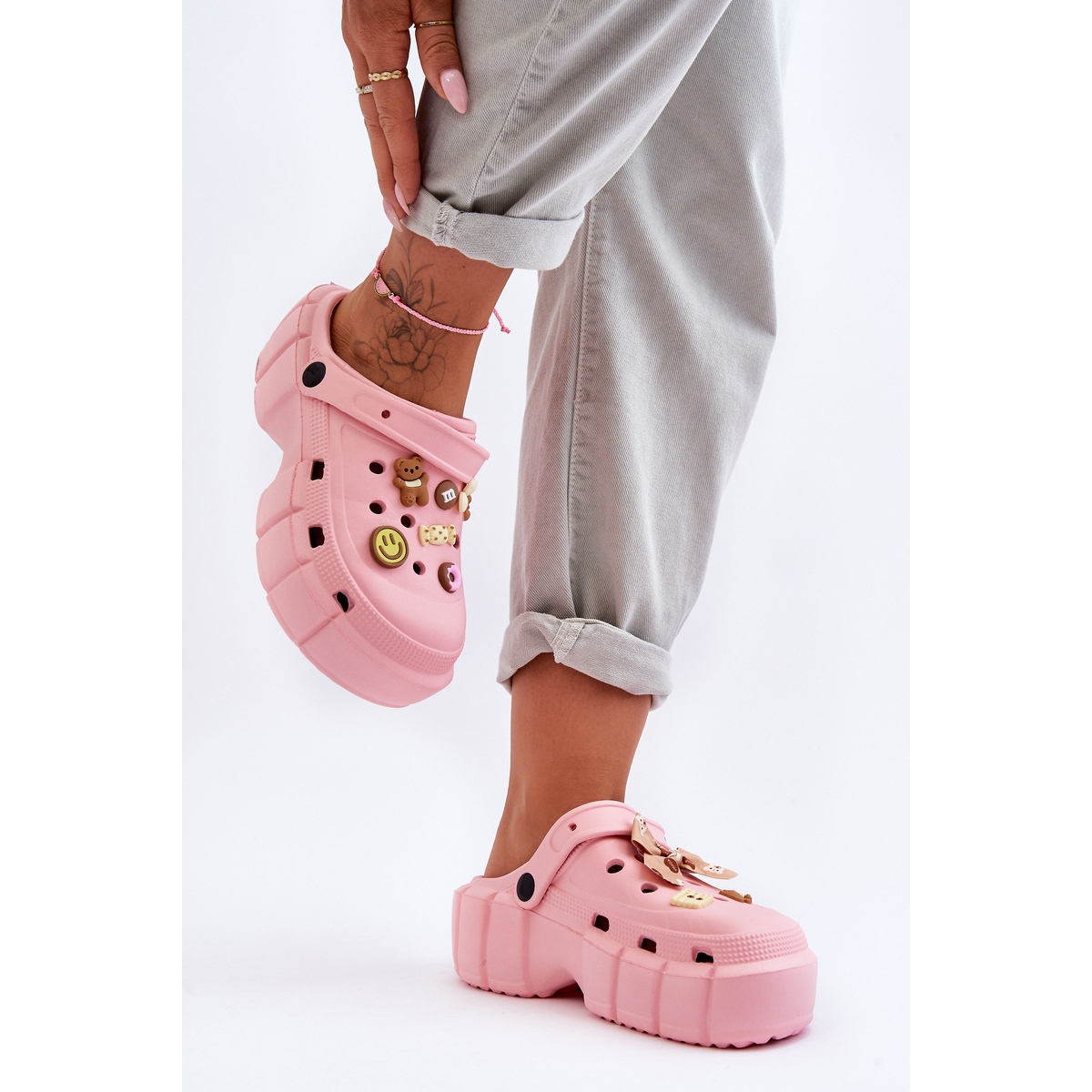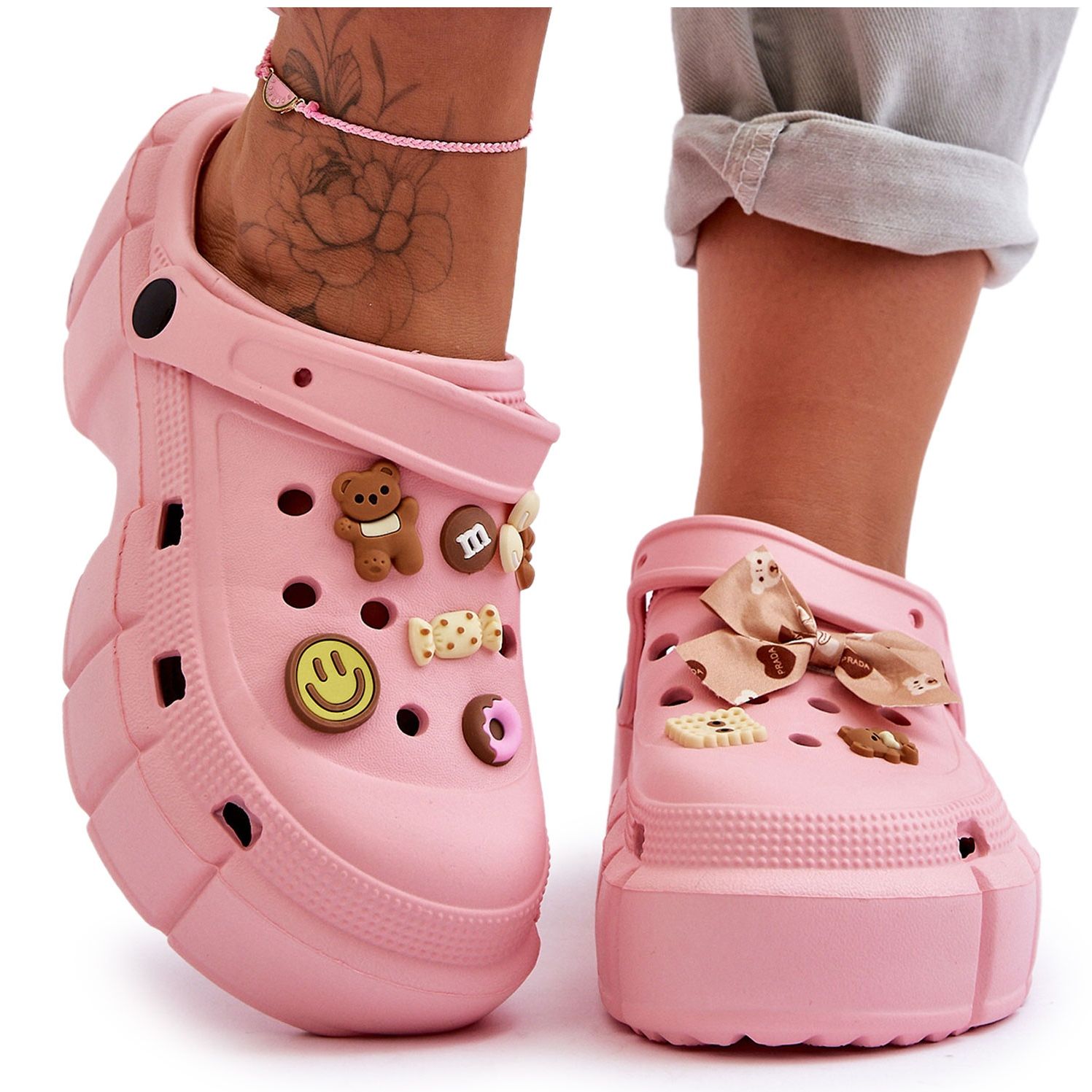 Estos cocodrilos únicos son la definición de comodidad veraniega combinada con un poco de dulce fantasía. Ligeras como una nube, fabricadas con un innovador material de espuma, proporcionarán a tus pies comodidad y libertad durante todo el día. Además, los adornos de diseño en la parte superior dan a estas chanclas un carácter único, asegurando que no pasarás desapercibida con ellas.