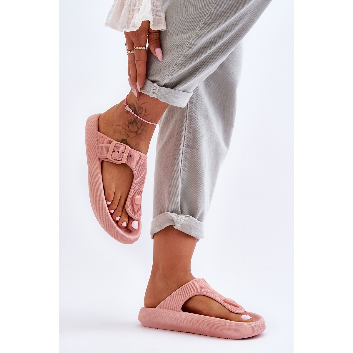 El cierre de hebilla permite un ajuste perfecto a la forma del pie y su construcción aireada las convierte en una opción ideal para los días cálidos. Son perfectos tanto para la playa como para la piscina, proporcionando un aspecto elegante en el clima veraniego. El color rosa de las chanclas se adapta a las tendencias actuales y aporta frescura a cualquier estilismo.