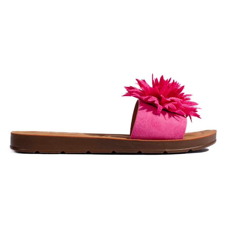 Estas chanclas informales son fáciles de poner gracias a la inserción y al sujetador abierto. Su estilo clásico se adapta perfectamente al verano, estilizaciones diarias. El color fucsia con una flor les da un encanto especial, y la suela de plástico marrón asegura la estabilidad y la comodidad al caminar.