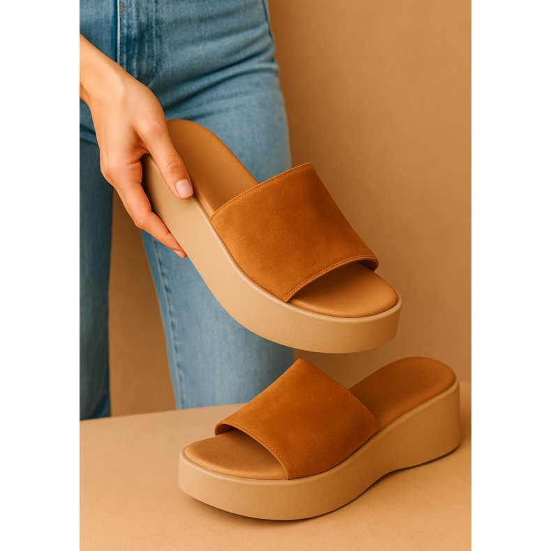 Las plataformas de gamuza requieren cuidados más delicados. Cepíllelos regularmente con un cepillo de goma para gamuza, que eliminará el polvo y levantará la pila del material. Antes del primer uso y periódicamente durante toda la temporada, impregnarlas con un preparado que proteja de la humedad y las manchas. Evite usar chanclas de gamuza en los días de lluvia. Si aparecen manchas, utilice una goma de borrar especial para gamuza o haga que un profesional limpie los zapatos.