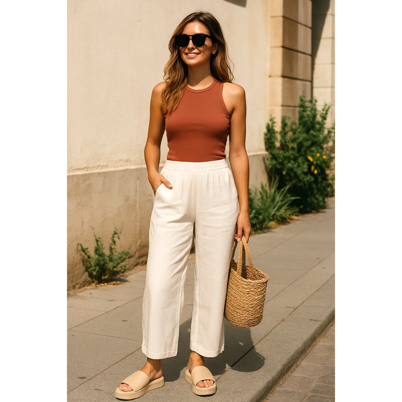 Los pantalones de lino de corte holgado quedan fenomenales con solapas de plataforma. Elige pantalones blancos o crema y combínalos con un top ajustado de un color contrastante, como terracota o verde botella. Añade un bolso de mimbre y gafas de sol grandes. Este estilo es perfecto para un almuerzo en el jardín de un restaurante o para una feria urbana de verano.