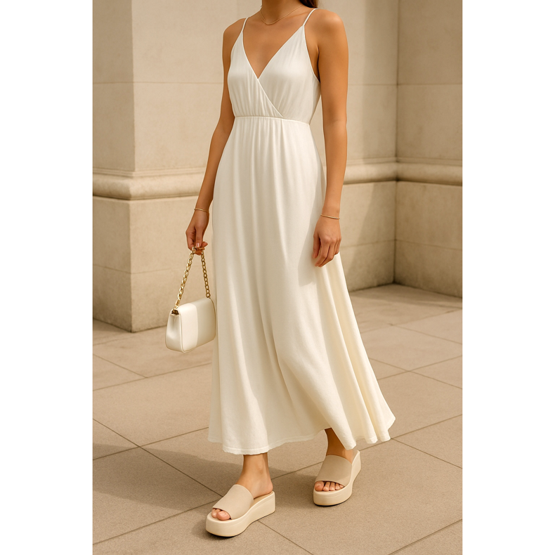 Para un vestido largo largo hecho de materiales delicados y aireados, elija chanclas con una plataforma mediana en un tono tenue. Las plataformas blancas o beige combinarán perfectamente con un vestido monocromático brillante. Agrega pequeñas joyas de oro y un pequeño bolso de cadena. Este estilo será perfecto para una boda de verano en el jardín, una fiesta en el jardín o una elegante fiesta al aire libre.