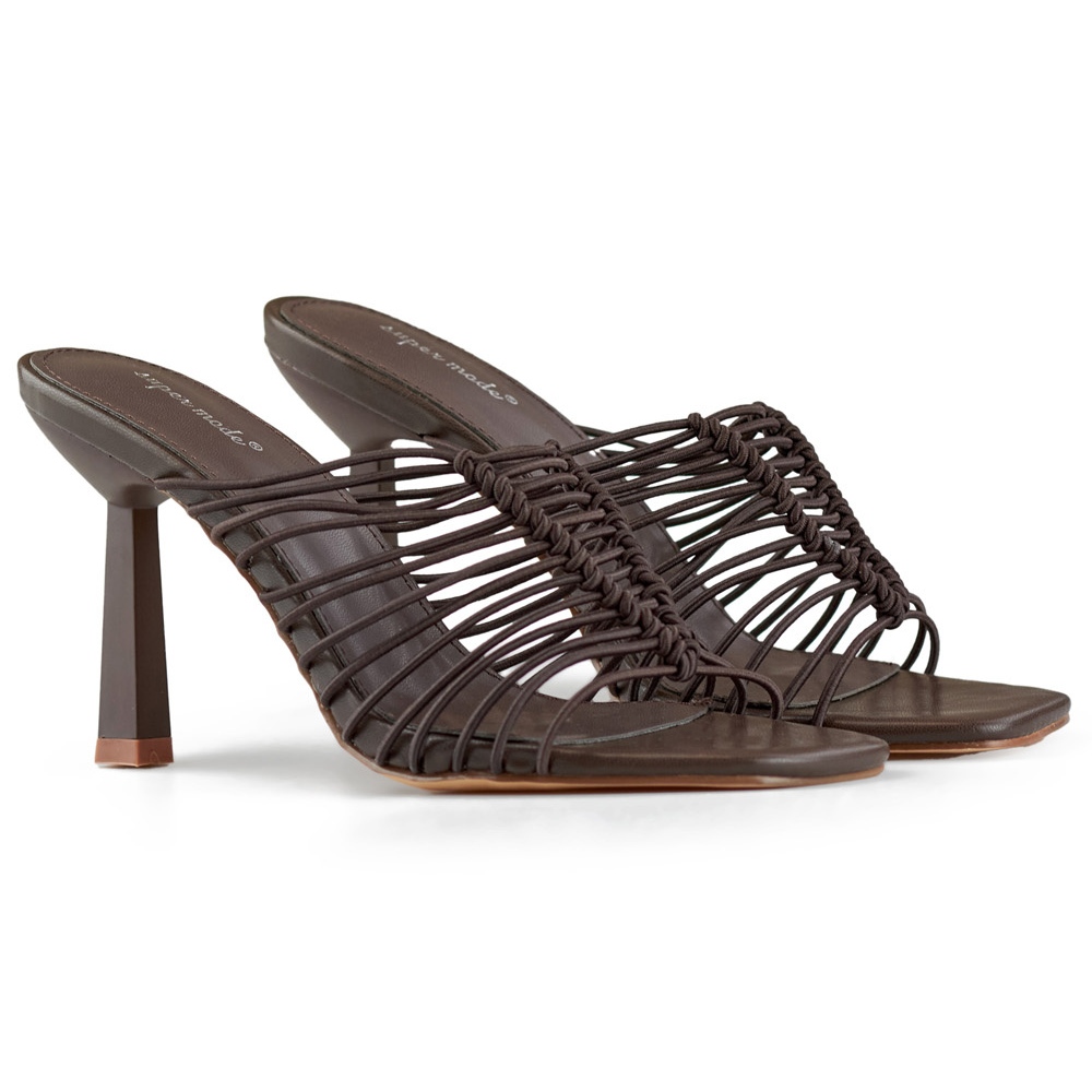 Detalles: Chanclas de tacón alto, chanclas de mujer elegantes y flexibles con tacón alto marrón.
