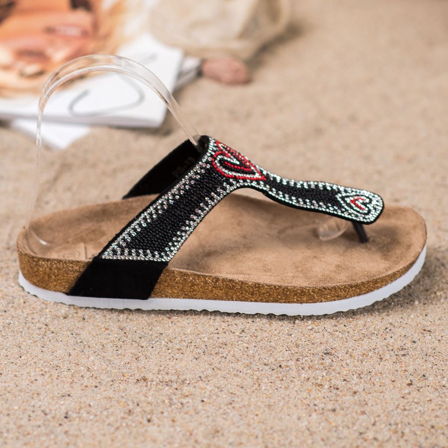 Las correas que sujetan el pie están decoradas con delicadas cuentas y circonitas, que les confieren un carácter único y una sutil elegancia. Además, la suela de plástico con banda de rodadura proporciona un buen agarre, lo cual es muy importante durante las caminatas de verano.