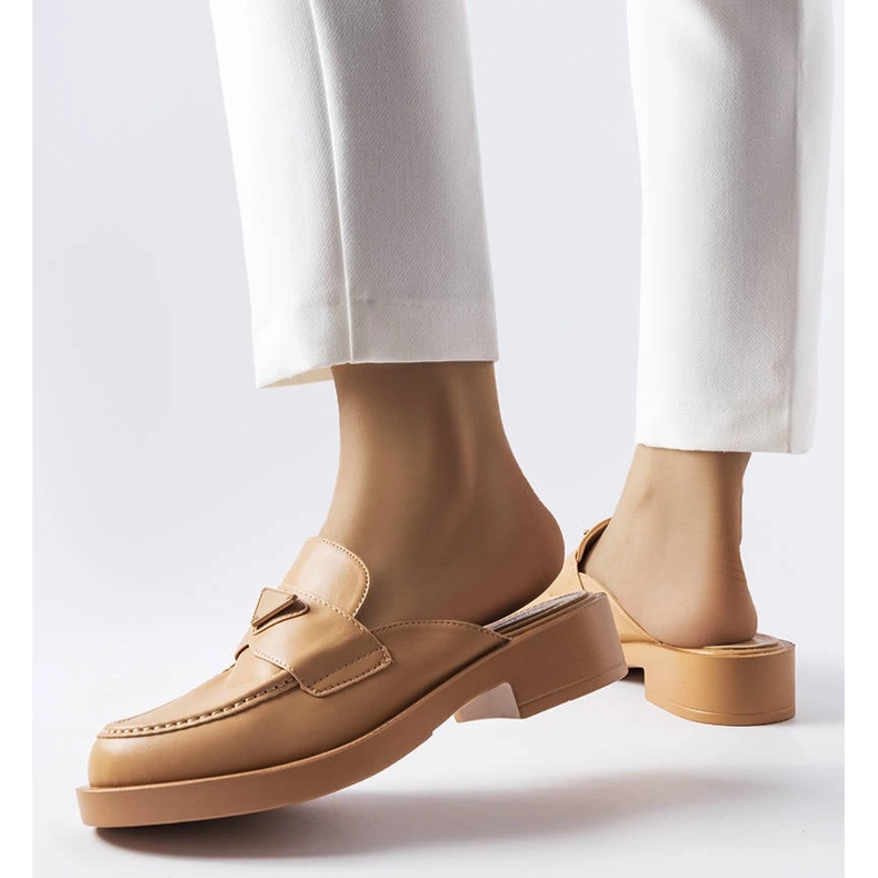 Clásico y al mismo tiempo elegantes flips berkshire -flops a la sombra de caqui (marrón) combinan comodidad con sutil elegancia. Un modelo de ceñada plana con un dedo redondeado construido en cuero ecológico. Las costuras suaves y una decoración de metal en el frente le dan a los zapatos un carácter sofisticado, ideal para estilizaciones diarias cuando quieres lucir ordenada y femenina.