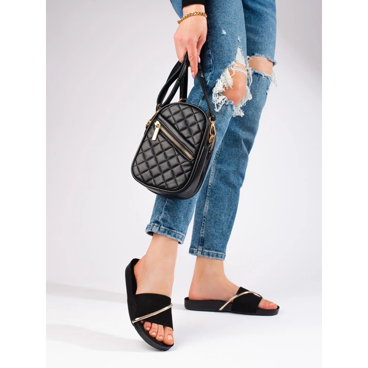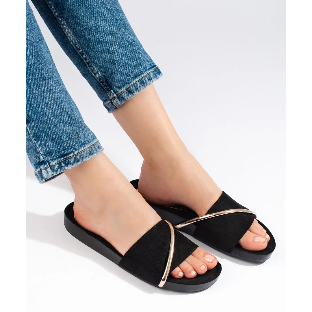 El característico color negro y la suave textura anteada de la piel ecológica utilizada para crear la parte exterior del calzado hacen que estas chanclas luzcan sumamente elegantes. Esta es una combinación que corresponde a las tendencias actuales de la moda femenina y encaja perfectamente con la variada paleta de colores del guardarropa.