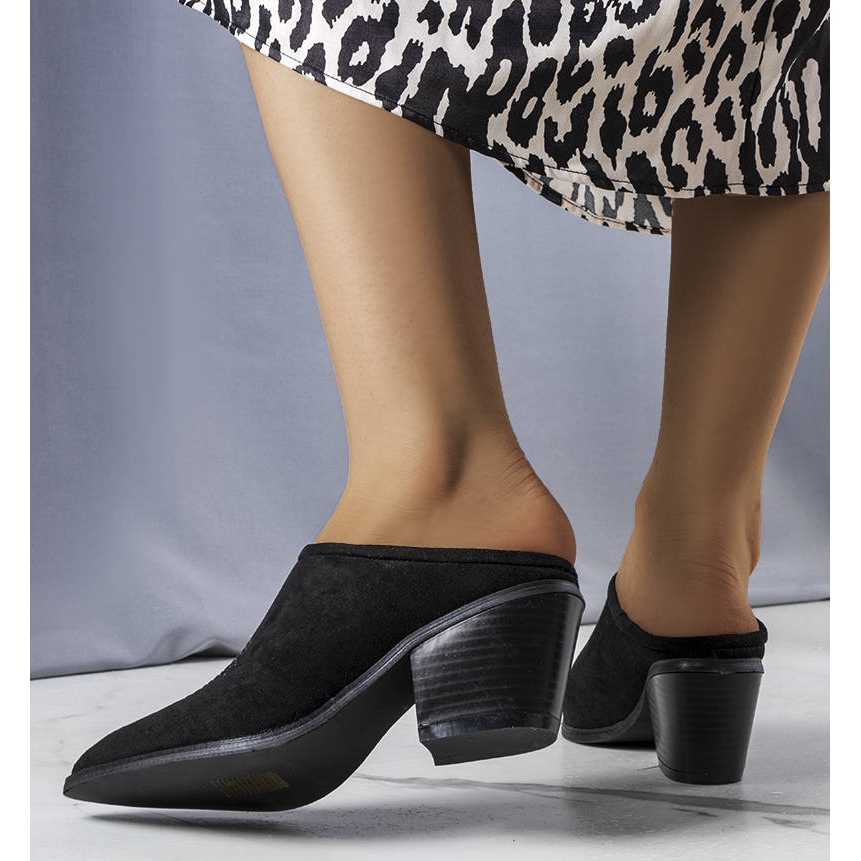 Las chanclas negras con frente cerrado de Linda son imprescindibles en cualquier guardarropa de verano. Estas elegantes y cómodas chanclas de mujer llaman la atención por su estilo único, que remite al calzado vaquero. Un tacón ancho, ligeramente inclinado, de 6 cm de altura y una punta puntiaguda les confieren elegancia, y la parte superior construida resalta perfectamente las ventajas del pie.