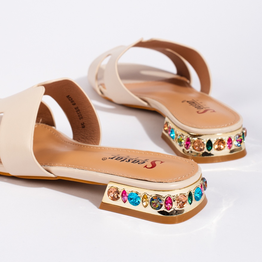 Este modelo se caracteriza por un sujetador deslizante y un talón abierto, lo que hace que ponerlos y quitarlos sea rápido y simple. Una suela suave hecha de plástico duradero asegura la estabilidad y la comodidad al caminar. Además, los diamantes de minos sutiles le dan a las aletas un acento elegante, lo que hace que se mezclen perfectamente con estilizaciones diarias y atuendos más elegantes.