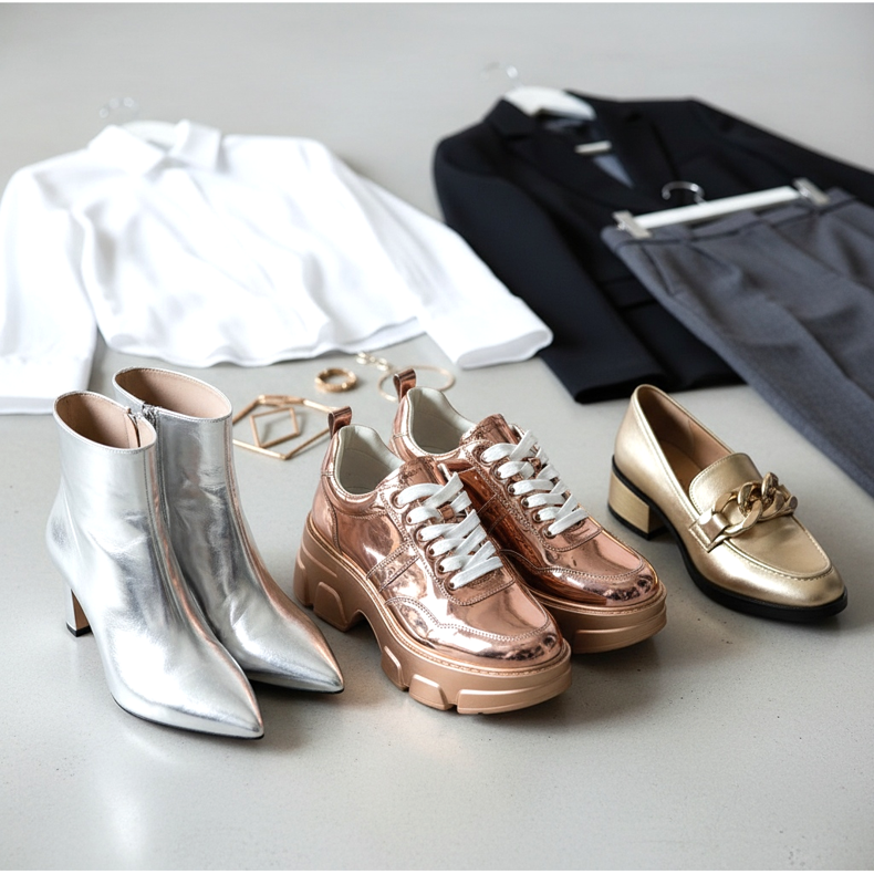Si eres valiente, el marrón metalizado, el plateado o el dorado son los colores que arrasarán en la primavera de 2026. Son populares sobre todo en colecciones premium y en lugares de trabajo más creativos. Use zapatos metálicos con atuendos neutros (negro, blanco, gris) para que no haya demasiado destello a la vez. Por la noche, unas zapatillas o botas metálicas pueden convertirse en un gran complemento para un estilismo elegante. Durante el día, los zapatos con plataforma metálica o las zapatillas deportivas lucirán modernos y a la moda, especialmente si los combinas con ropa minimalista.