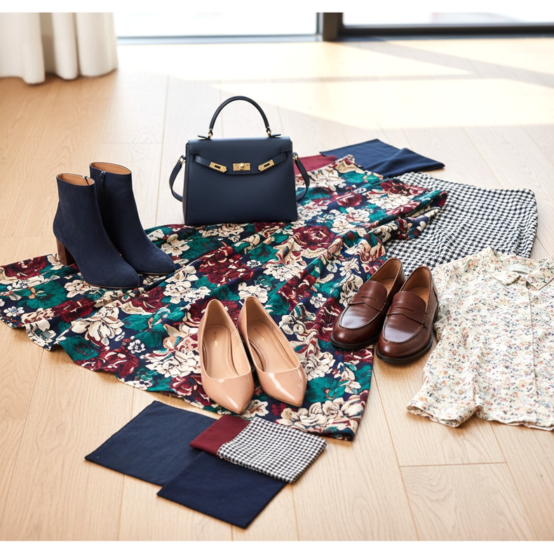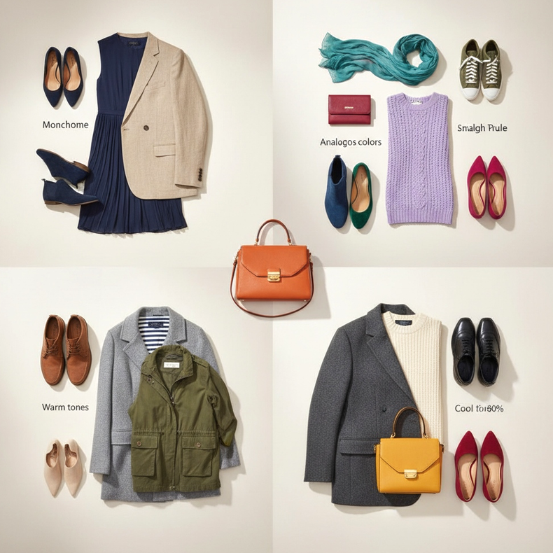 La regla 60-30-10 te ayudará a equilibrar los colores en tu estilismo. El 60% del conjunto debe ser el color dominante (por ejemplo, vestido), el 30% el color secundario (por ejemplo, bolso, abrigo) y el 10% el color de acento (por ejemplo, zapatos, joyas). Los zapatos como acento pueden ser expresivos sin abrumar el conjunto.