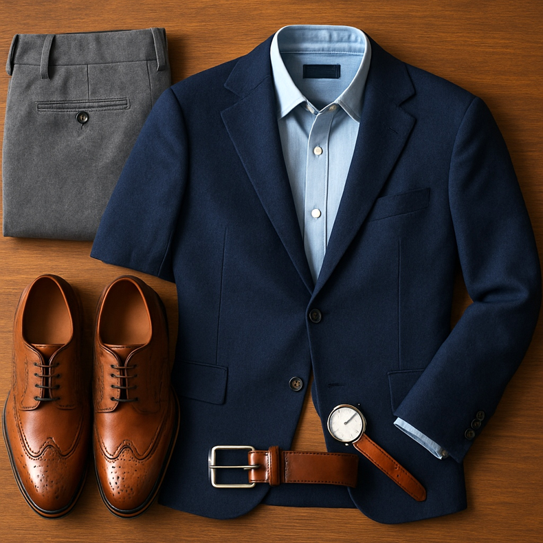 Traje (sin corbata) + camisa + zapatos Oxford marrones/negros. Reloj minimalista.