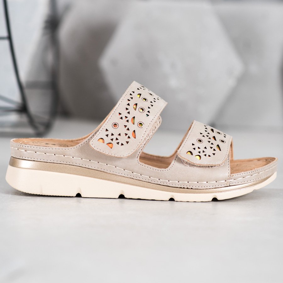 Las chanclas tienen un innovador cierre de cierre adhesivo que garantiza un fácil calce y un ajuste perfecto al pie. Un pequeño tacón de 4 cm de altura colocado sobre una cuña aporta elegancia y al mismo tiempo no carga los pies, lo que los convierte en una opción ideal para estar cómodos durante todo el día.