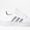 Los zapatos son blancos, están hechos de tela; Se colocan tres rayas negras en el costado del cordón, el logotipo del productor.