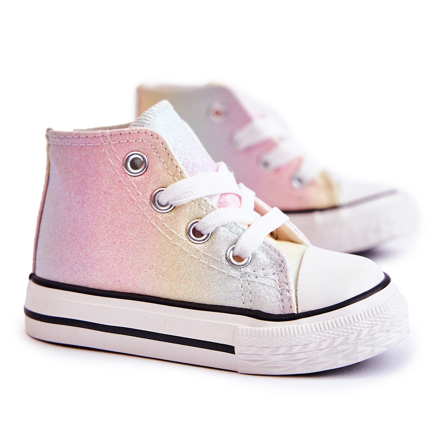 Las zapatillas de deporte coloridas, ligeras y cómodas para las niñas que son perfectas para la temporada de primavera y verano. Hecho de material textil, decorado con brillo, con un enlace clásico en los cordones. La nariz reforzada con plástico de goma, inserto de material suave y suela de goma sinlips (aproximadamente 2 cm) aseguran la comodidad y la seguridad mientras juega. El talón rígido estabiliza el pie, y la falta de calentamiento los hace apropiados para los días más cálidos.