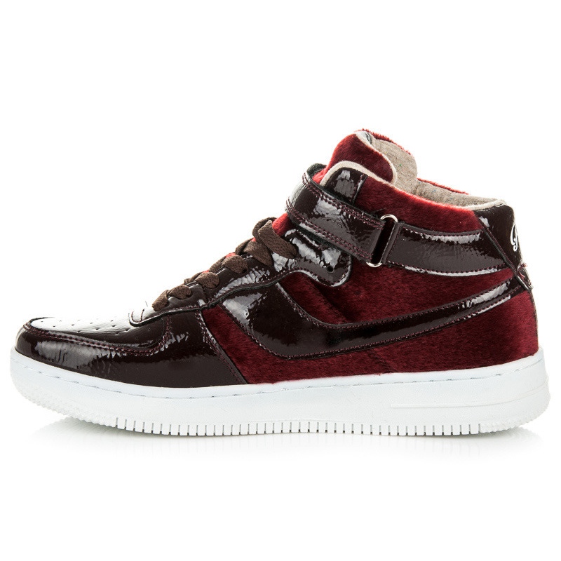 La altura de la plataforma de 2,5 cm proporciona una amortiguación adecuada, lo que hace que los zapatos sean perfectos para el uso diario. Su acabado lacado en color burdeos encaja perfectamente en las tendencias, añadiendo un acento único a cualquier estilismo.