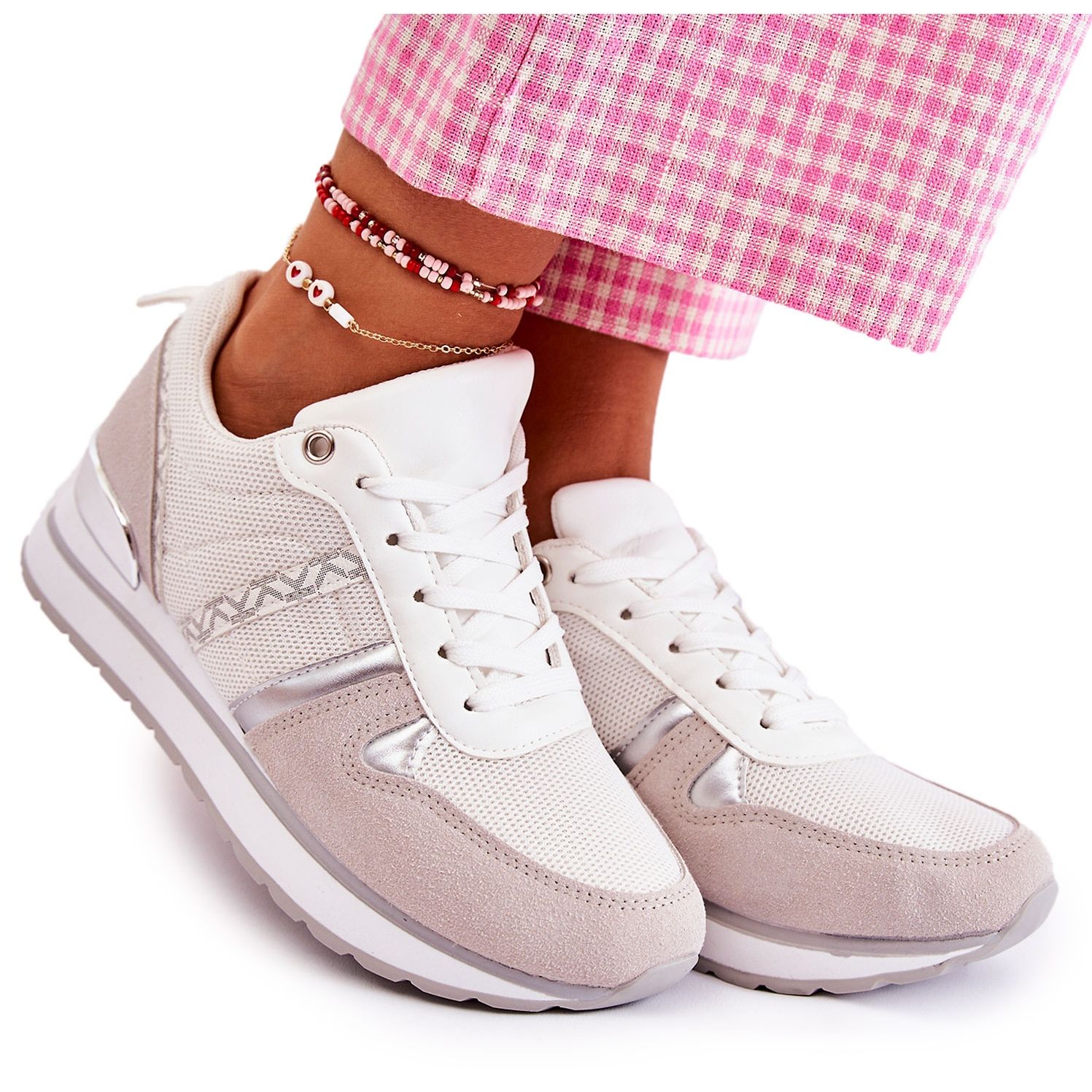 La suave parte superior del tobillo hecha de material transpirable, gamuza ecológica y cuero ecológico garantiza comodidad de uso incluso durante largas horas. El interior del zapato está equipado con un cómodo inserto de espuma cubierto de tela, que aumenta aún más la comodidad de uso. Gracias a los cordones planos, los zapatos se pueden ajustar perfectamente al ancho del pie, lo que los hace perfectos para cualquier mujer.