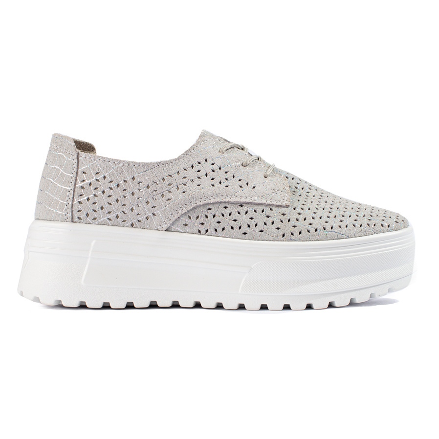 Descubre la elegancia combinada con la comodidad gracias a las zapatillas de piel caladas con plataforma alta de la marca Shelovet en color gris plateado. Estos zapatos de mujer únicos combinan un diseño moderno y una comodidad superior a la media, lo que los convierte en una opción ideal para el día a día y para ocasiones especiales.