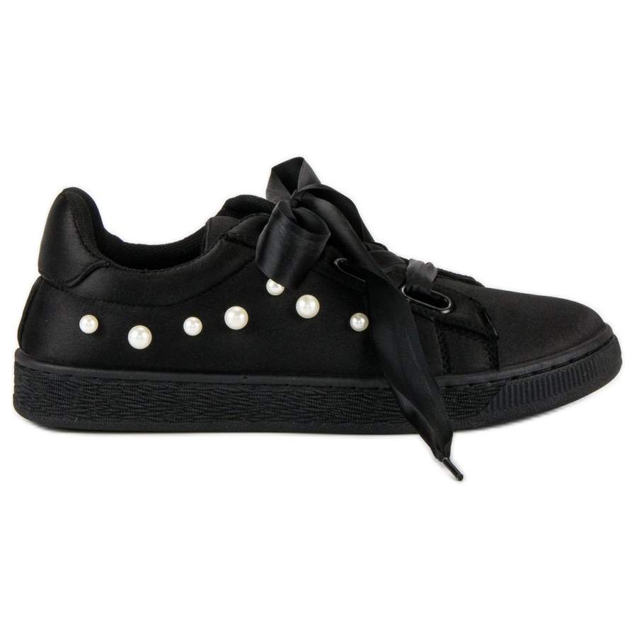 Las zapatillas de raso negras con perlas blancas y originales cordones son imprescindibles en el armario de toda mujer. Su color universal significa que puedes combinarlos fácilmente con varios estilos, desde casual hasta un poco más elegante. Gracias a la punta redonda y a los detalles sutiles, las zapatillas lucen extremadamente elegantes y añaden un toque femenino y romántico a cualquier conjunto.