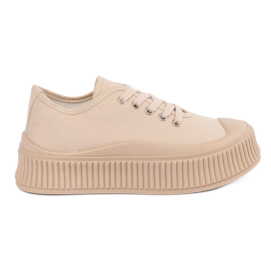 Una suela de plástico con una banda de rodadura garantiza la adhesión y la estabilidad en varias superficies, lo que hace que estas zapatillas de deporte sean ideales para viajes urbanos. El color beige los hace extremadamente versátiles y combinan con muchos estilos, desde jeans hasta vestidos de verano.