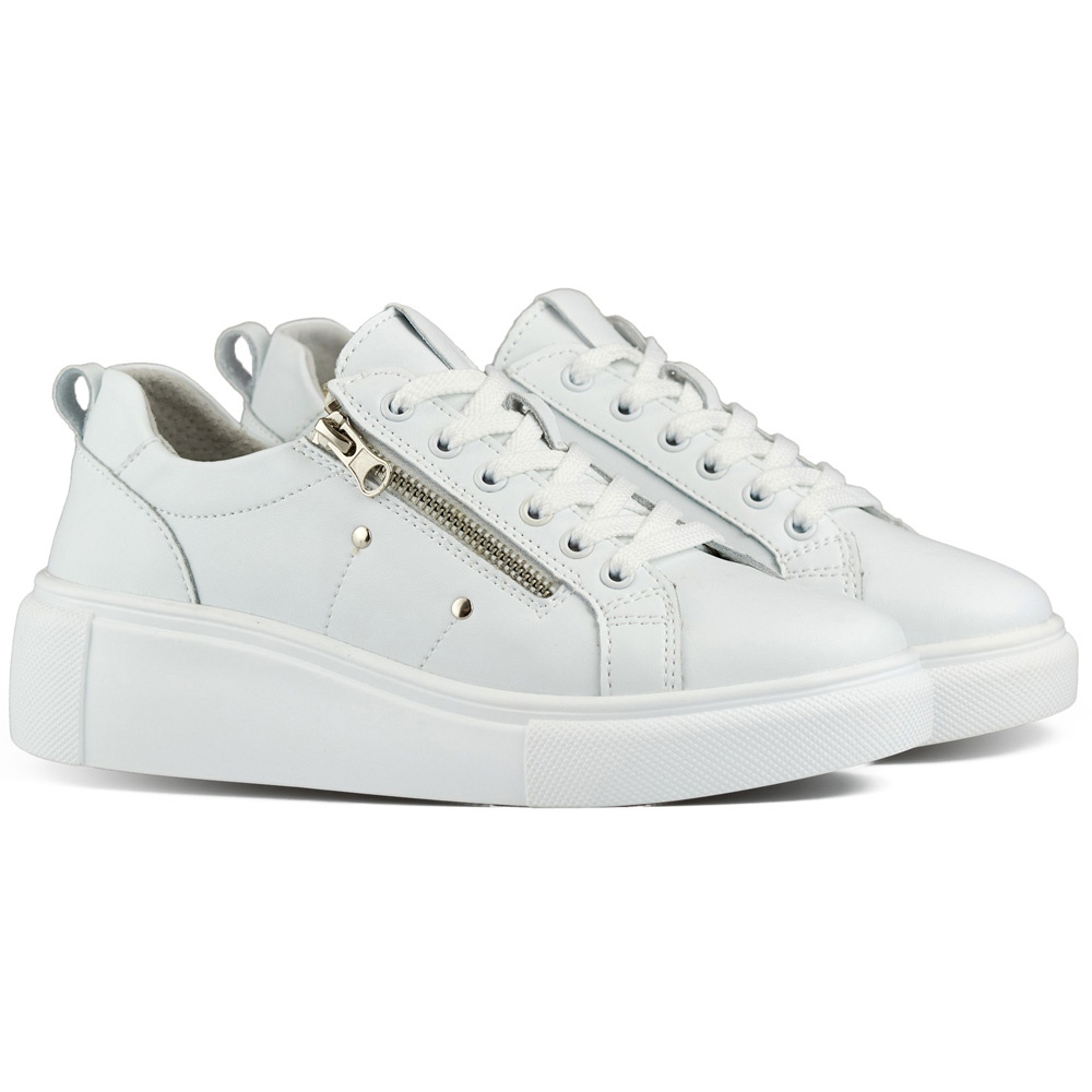 Estos zapatos deportivos de moda se distinguen por un color blanco clásico que va perfectamente con muchos estilos, desde un aspecto casual hasta más sets deportivos. La plataforma de 4,5 cm de altura utilizada en ellos le dará ligereza y delgada su figura, y la nariz redonda proporcionará la máxima comodidad durante el uso diario.