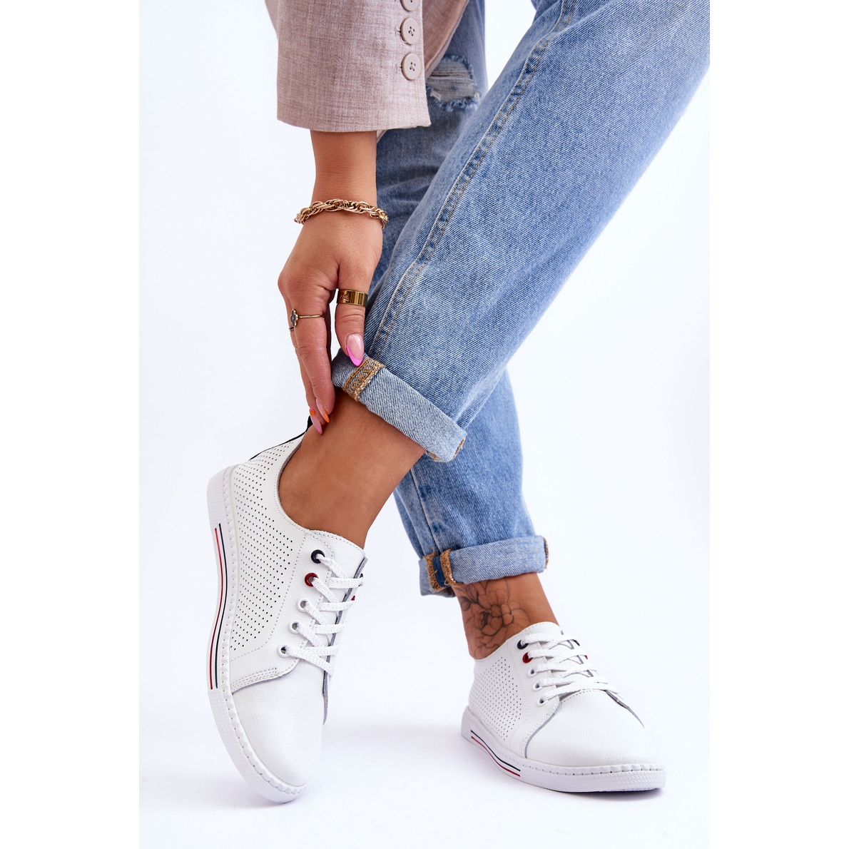 Una propuesta ligera, elegante y aireada para los días más cálidos: zapatillas de deporte de Ferone bajas hechas de cuero natural. La parte superior de trabajo abierta proporciona una excelente ventilación, y el inserto de comodidad suave del cuero natural garantiza la comodidad durante todo el día. El modelo se establece en una plataforma de 2 cm con una suela de goma sin copa. Los cordones con un hilo decorativo agregan un carácter sutil, y el color blanco clásico puede coincidir fácilmente con las estilizaciones diarias.