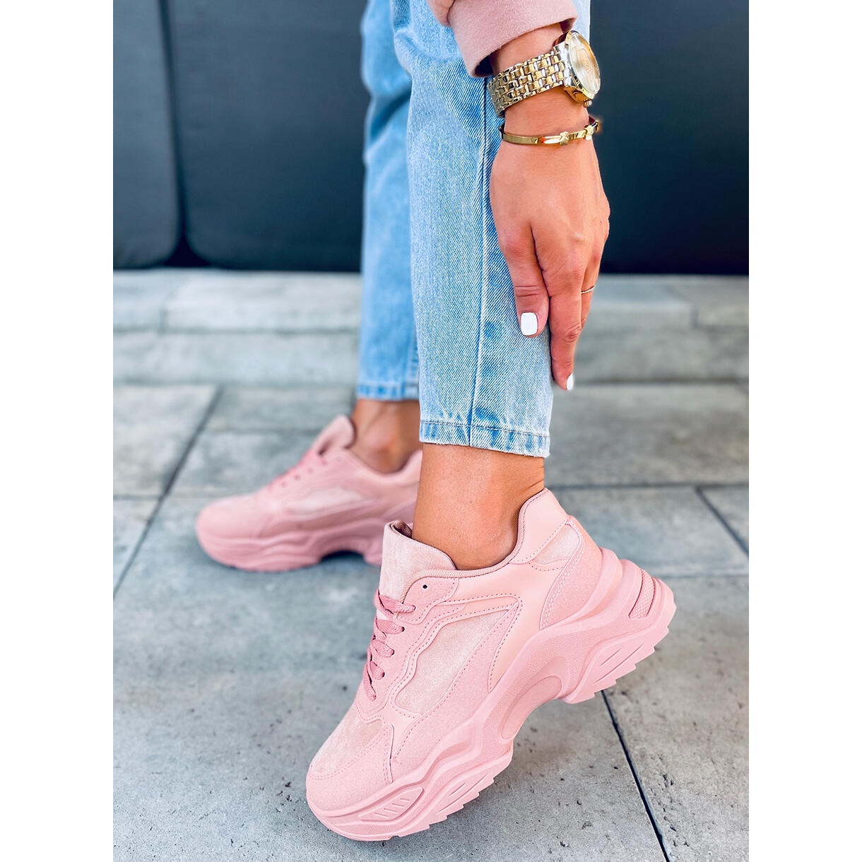 Los zapatos Dalla Pink se caracterizan por una moderna suela gruesa, que no sólo aporta un carácter deportivo, sino que también proporciona una amortiguación adecuada durante las actividades cotidianas. El interior de los zapatos está forrado con un tejido agradable, lo que los hace cómodos incluso cuando se usan durante mucho tiempo. La puntera redonda y el tacón plano las convierten en una solución ideal para el uso diario y durante el entrenamiento.