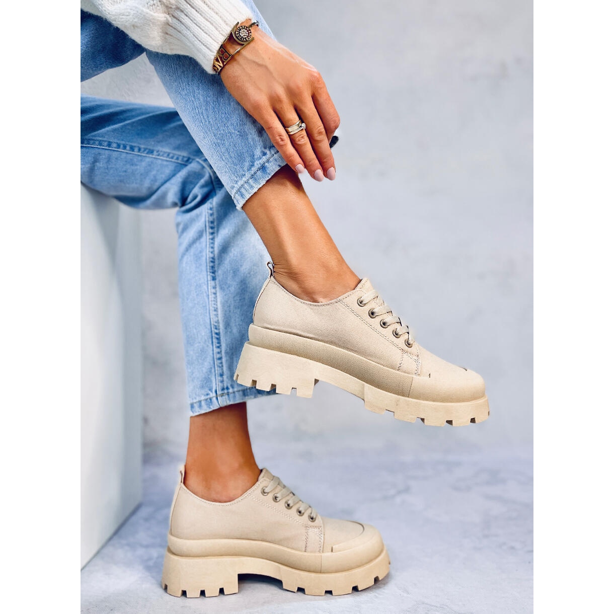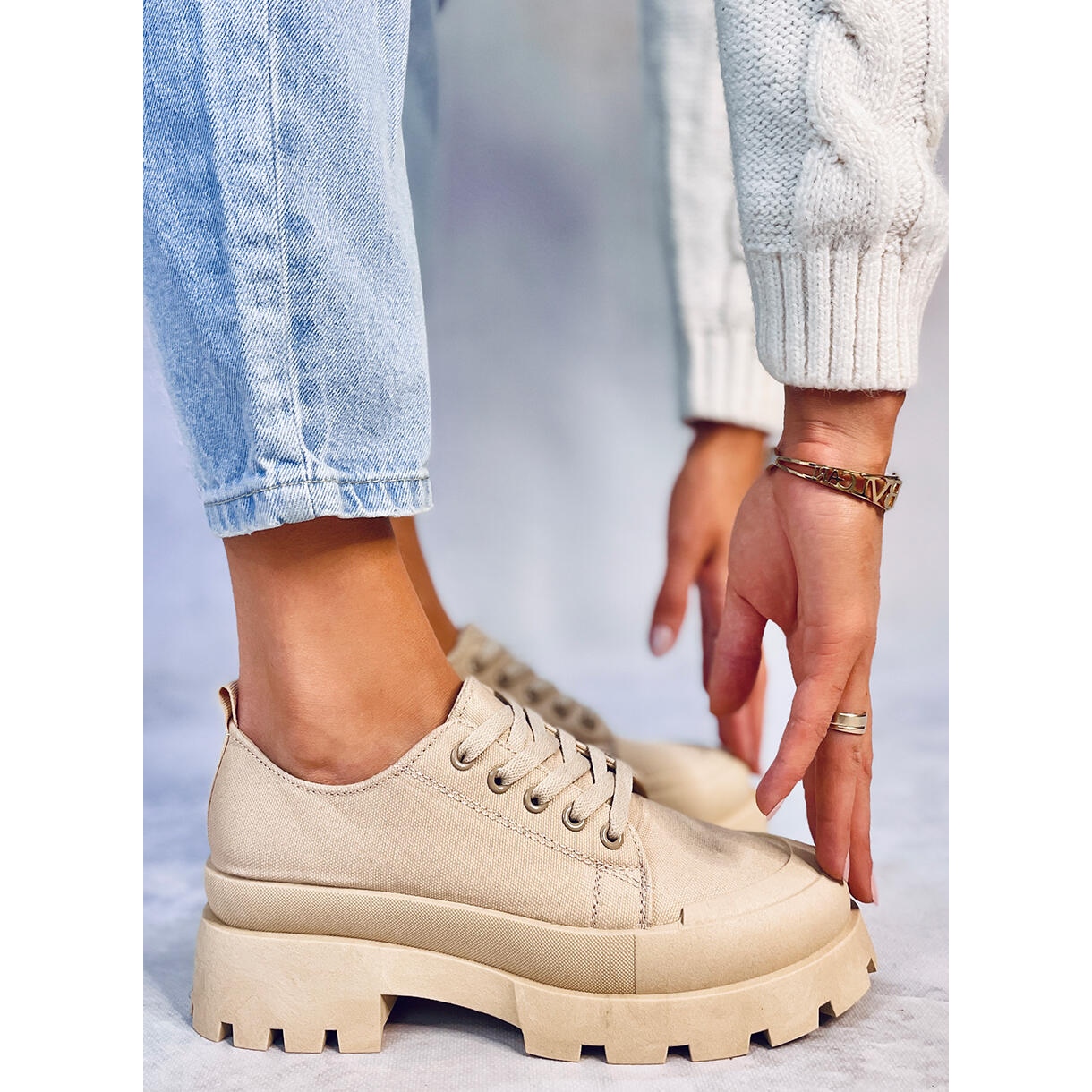 Las zapatillas trekking de lona para mujer son unos zapatos tremendamente estilosos en color beige, fabricados en tela, tanto por fuera como por dentro. Los zapatos tienen suelas gruesas y sintéticas, que no sólo los hacen atractivos, sino también cómodos y prácticos. Las zapatillas tienen un tacón plano de 4 cm, lo que las hace perfectas para el día a día. Fueron diseñados para mujeres que valoran la originalidad y la comodidad.