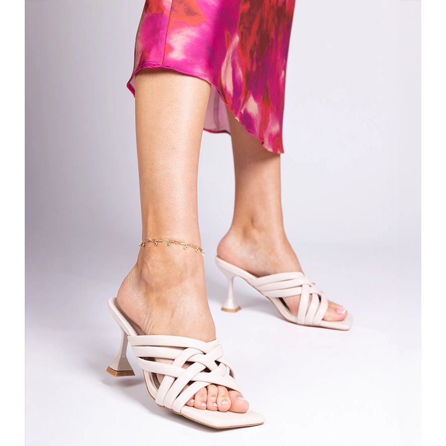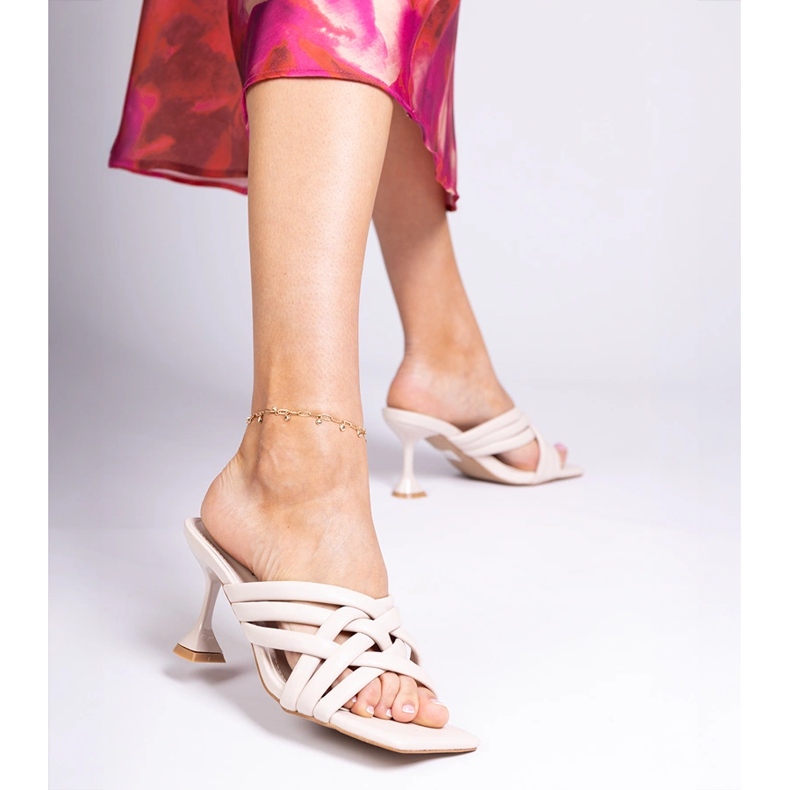 La puntera cuadrada añade innovación y estilo moderno a las chanclas, garantizando al mismo tiempo comodidad. La altura del tacón de 8,5 cm está perfectamente equilibrada para garantizar la elegancia sin comprometer la comodidad.